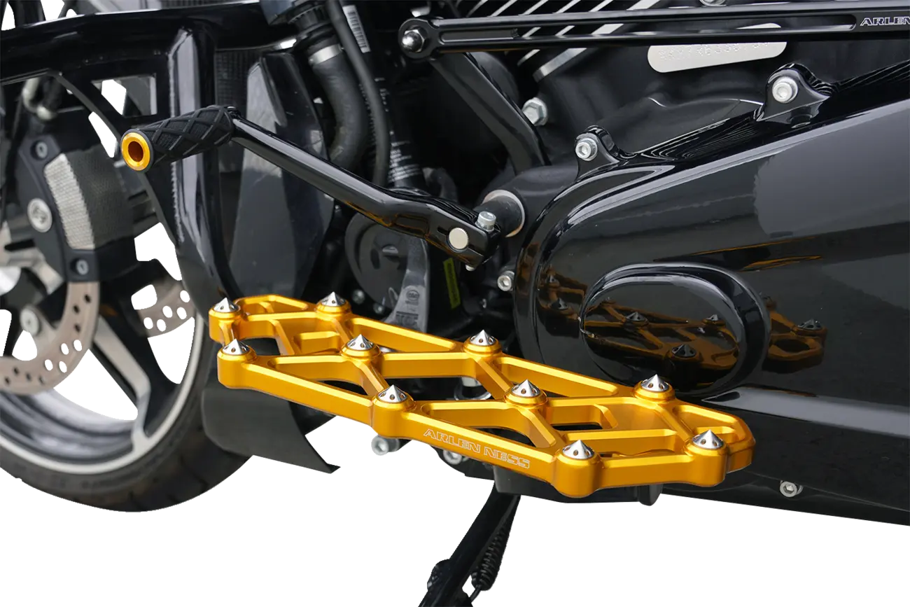 The Arlen Ness Diamond Floorboards are CNC machined from billet aluminum, ensuring exceptional strength and durability. The aggressive diamond-cut pattern provides a non-slip surface, while integrated titanium inserts, or "spikes," maximize foot traction for a secure and confident riding experience. The anodized gold finish adds a touch of custom flair to your motorcycle. Designed for driver-side installation, these floorboards offer a direct bolt-on fit for easy installation. Maximize style and grip while riding with these impressive floorboards.