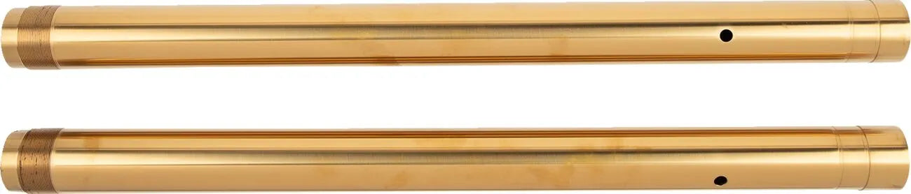 These 43mm inverted fork tubes are engineered to fit a wide range of models, offering a significant upgrade in suspension performance. The tubes are compatible with OEM legs and cartridges, simplifying the installation process. Each set includes 2" spacers for plus-size tubes, providing added versatility. Crafted with precision and care in the U.S.A., these fork tubes meet the highest standards of quality and are built to withstand the rigors of the road. Improve your bike's stability, handling, and aesthetics with these premium fork tubes. The gold finish adds a touch of style to your motorcycle, making it stand out from the crowd. With lengths of 23.00" (584.20 mm) for the left-hand tube and 22.75" (577.85 mm) for the right-hand tube, these tubes are designed for optimal performance.Features & highlights