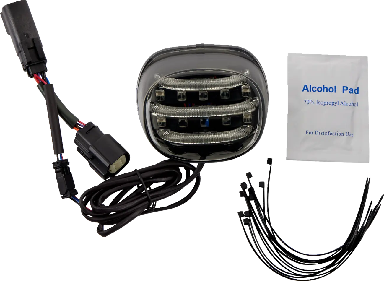The ProBeam® Mini Taillight features a modern LED light pipe design, with three running light pipes that illuminate across the taillight. These function as running lights, while 10 full-intensity brake LEDs ensure maximum visibility when braking. The low-profile design protrudes only 2" from the fender, maintaining a streamlined appearance. This completely sealed unit mounts securely to the rear fender with double-sided tape, and the wires route cleanly behind the Turn Signal Eliminator bracket. Enjoy a hassle-free installation with its plug-and-play design, requiring no drilling.