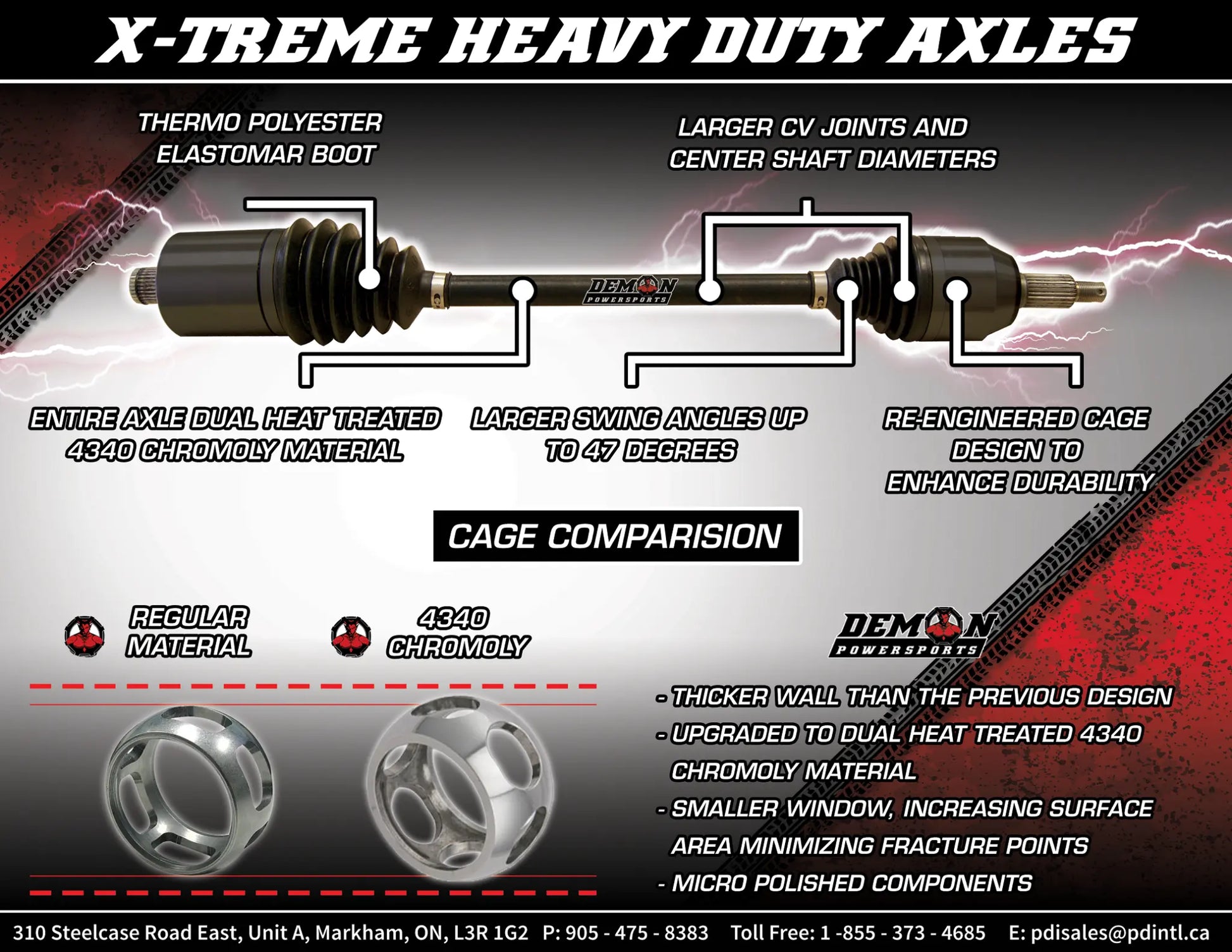 The Demon Heavy-Duty X-Treme Axle is constructed from high-strength 4340 chromoly steel, providing exceptional resistance to breakage and wear. Featuring CNC-machined and micro-polished internal components, this axle offers enhanced precision and smooth operation. Its re-engineered cage design further improves durability, minimizing the risk of failure under heavy loads. The unique boot design optimizes heat reduction, keeping the axle cool even during intense riding sessions. With components 20-30% larger than standard heavy-duty axles, the Demon X-Treme delivers unmatched strength and reliability. This axle offers a swing angle up to 47°.