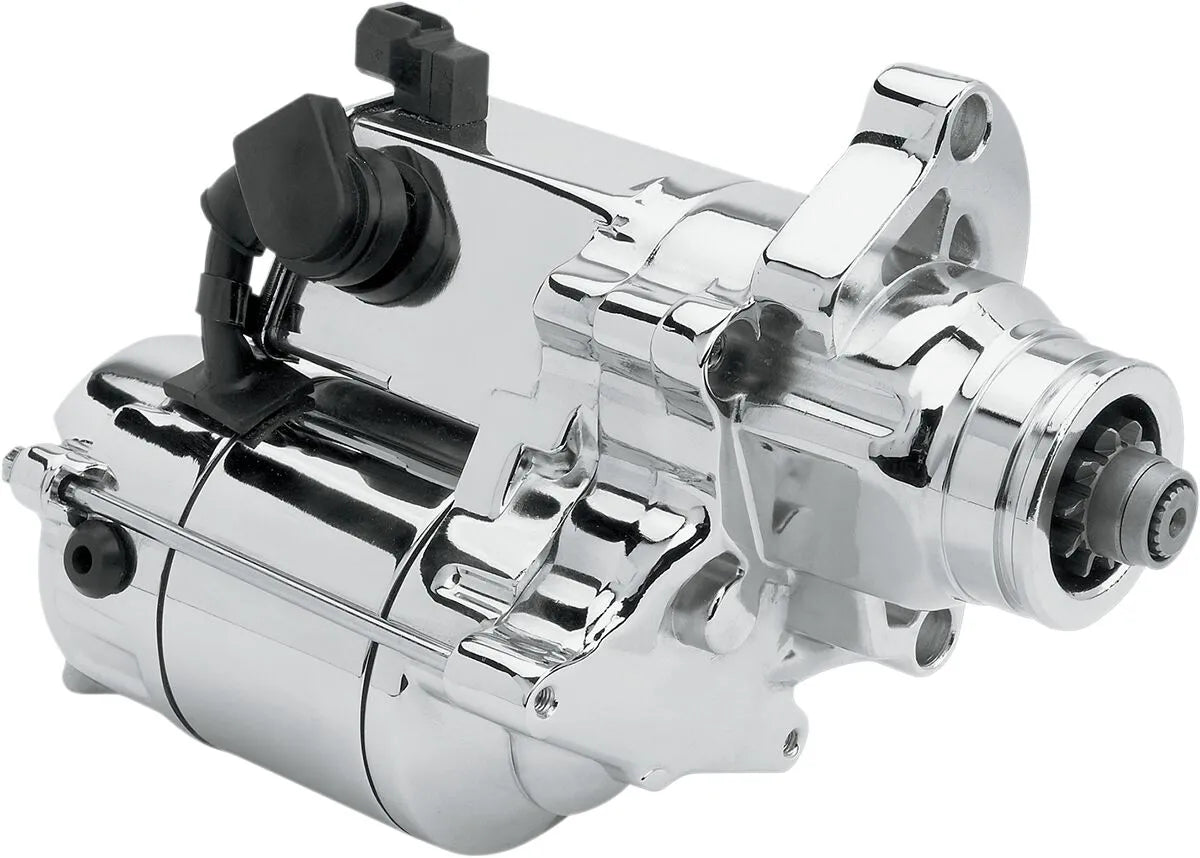 The Drag Specialties 1.4 kW Starter Motor is engineered to provide superior starting performance. Its special pinion shaft threads and extended jackshaft bolt allow for a wider range of applications, offering enhanced compatibility. Featuring oversize clutch rollers, cold headed steel idler gears, and armature hairpins that are resistance-fused to the armature, this starter is built to withstand the rigors of high-performance engines. The 1.4 kW output ensures reliable starting power, even in demanding conditions. This starter motor provides a significant boost over stock units, making it ideal for riders who demand the best. Upgrade your bike with this powerful and dependable starter motor for unmatched performance and peace of mind. The chrome finish adds a touch of style under the hood.