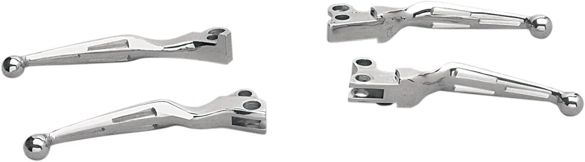 The Drag Specialties Slotted Wide Blade Lever Set is constructed from strong, high-quality aluminum and features CNC-machined slots for a distinctive look. The wide blade design offers improved leverage and a more comfortable feel, especially during long rides. Finished in chrome for a sleek appearance, these levers enhance the overall aesthetics of your bike. The set includes an anti-rattle clip to ensure quiet and smooth operation, along with clutch lever pivot bushings for added durability and precise action. These levers are designed for hydraulic actuation systems and are a perfect upgrade for enthusiasts seeking both style and performance. Easy to install, the Drag Specialties lever set will provide years of reliable service.