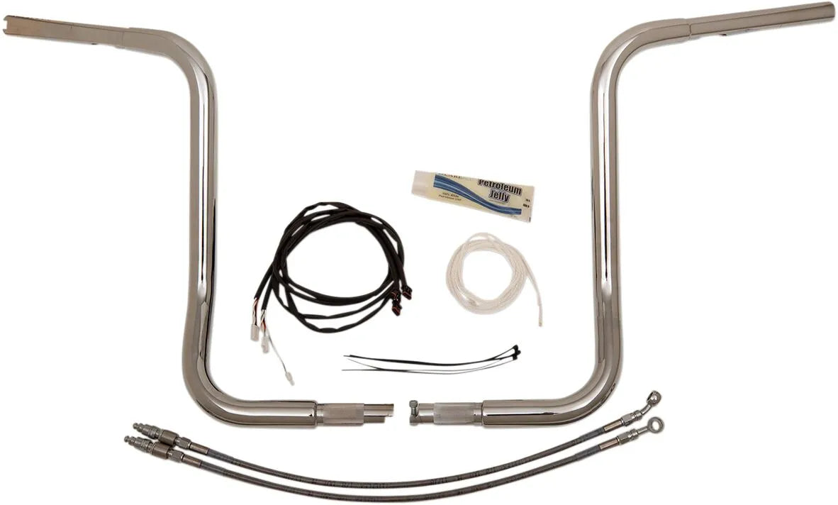 The Fat Baggers Inc. Handlebar Kit includes all the necessary components for installing handlebars based on your motorcycle's model and handlebar height. When required, the kit comes complete with a brake line extension, clutch line/cable extension, and wiring harness. These CNC mandrel-bent handlebars are constructed from heavy-duty 1-1/4" diameter x .120" wall steel tubing, ensuring exceptional strength and durability. The innovative bolt-together, two-piece design saves space and simplifies shipping. Proudly made in the USA, this kit extends your existing lines, providing a seamless and professional upgrade. These ape hanger style handlebars improve comfort and control, giving your bike a stylish, custom look.