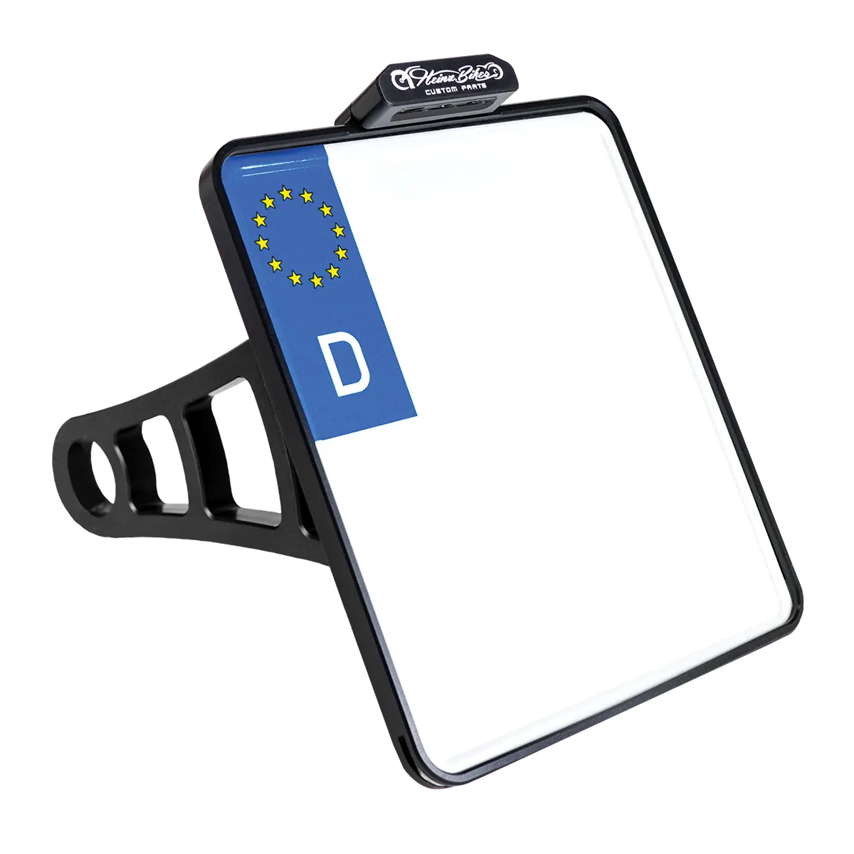 The Heinz Bikes License Plate Side Mounts feature the innovative SLIP-IN frame technology, allowing for screw-less mounting of the license plate. Integrated LED indicator lights are encased in sleek, CNC-machined aluminum housings, providing bright and efficient illumination. Internal cable routing ensures a clean and uncluttered appearance. The stable arm utilizes secure anti-twist technology at the swing arm for guaranteed stability. Available in anodized black or chrome finish to match your bike's aesthetic. These mounts offer an integrated LED taillight and license plate light for a modern touch.