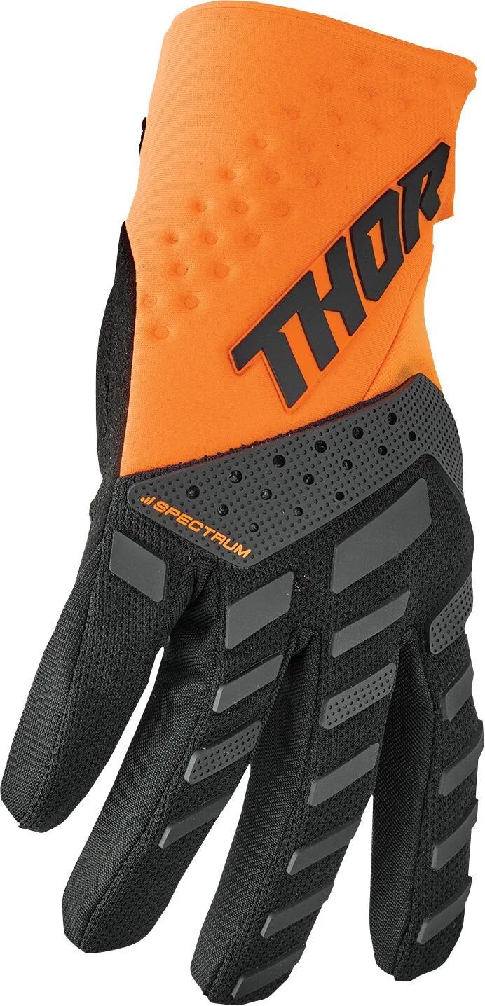 Experience superior control and feel with the Thor Spectrum Gloves. The direct inject TPR elements on the top hand and fingers offer enhanced protection against impacts and abrasions. The wrapped thumb and reinforced gripping points significantly increase durability, allowing for confident handling in demanding conditions. A mesh backhand and perforated palm ensure optimal airflow, keeping your hands cool and dry. The lightly padded palm provides a comfortable grip, reducing fatigue during long rides. Furthermore, the molded bio-foam wrist and backhand deliver additional comfort and support, while the refined chassis enhances overall fit and performance. The touchscreen-compatible fingertips on the index finger, middle finger, and thumb allow for convenient use of mobile devices without removing your gloves.