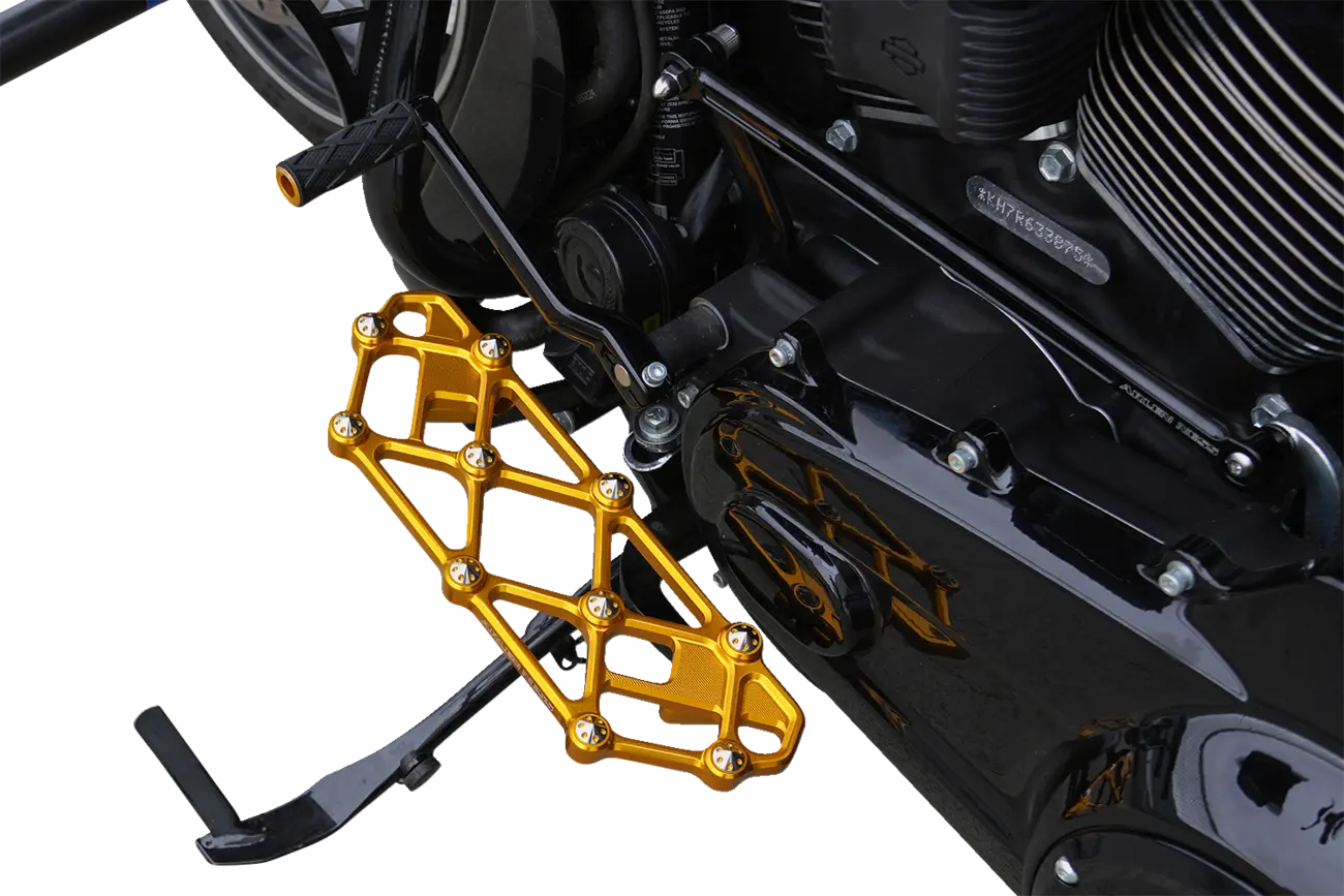 The Arlen Ness Diamond Floorboards are CNC machined from billet aluminum, ensuring exceptional strength and durability. The aggressive diamond-cut pattern provides a non-slip surface, while integrated titanium inserts, or "spikes," maximize foot traction for a secure and confident riding experience. The anodized gold finish adds a touch of custom flair to your motorcycle. Designed for driver-side installation, these floorboards offer a direct bolt-on fit for easy installation. Maximize style and grip while riding with these impressive floorboards.