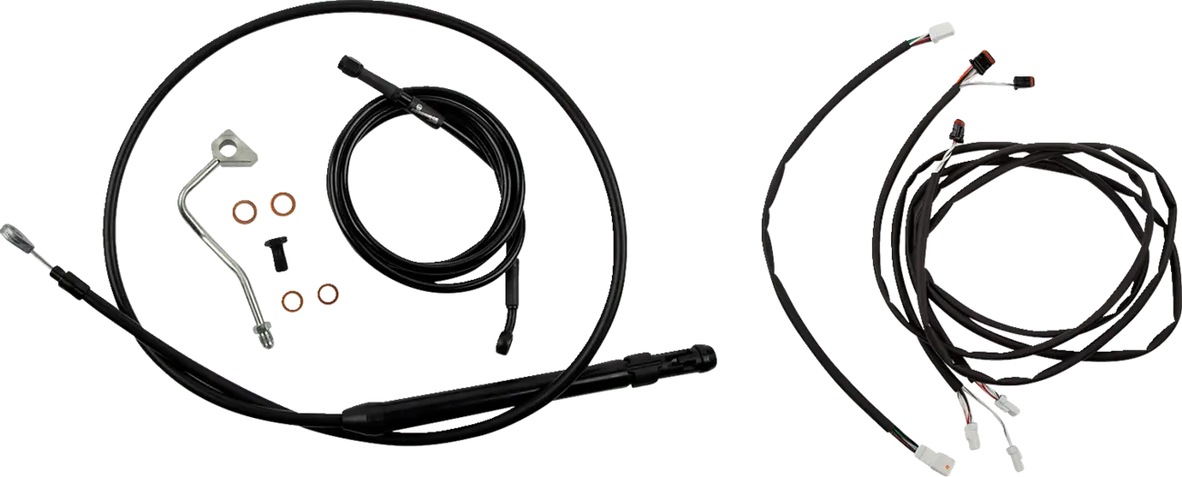 The Burly Brand Touring Model Control Kit eliminates the guesswork and hassle of sourcing individual parts. This all-in-one solution includes a clutch cable, brake line, main harness extension kit, shrink tubing, and a Throttle-By-Wire extension kit. Designed for use with standard 2" risers, this kit simplifies the handlebar installation process, allowing you to achieve the desired look and feel on your touring machine. The high-quality materials and precise engineering of this kit ensure reliable performance and long-lasting durability. This kit is designed for use with handlebars up to 14" tall.