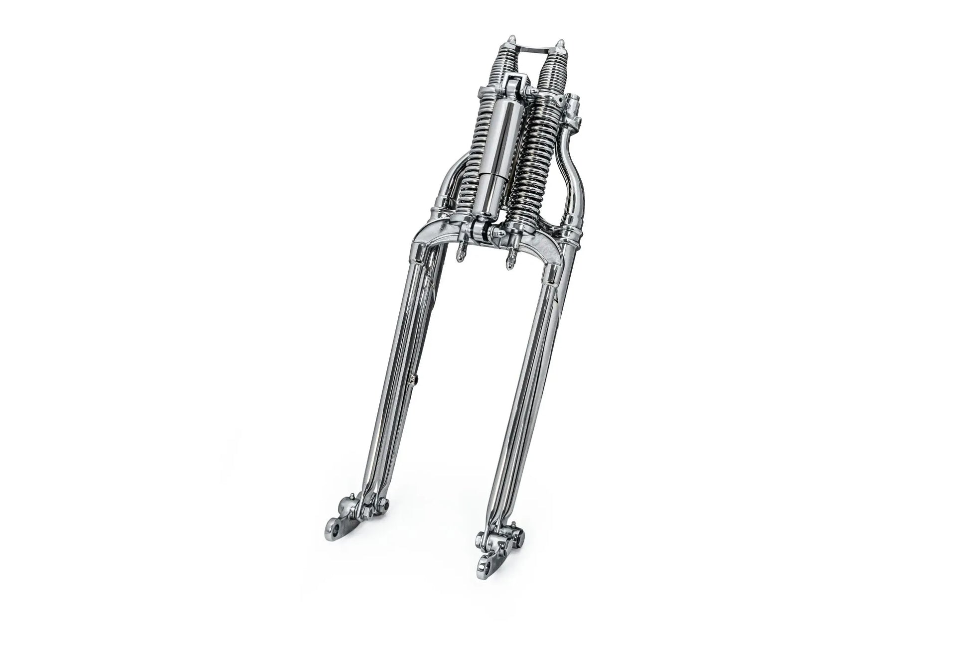 The Classic Bike Fork Assembly provides superior handling and a classic look for your motorcycle. Designed as a direct replacement for OEM springer forks, this assembly offers improved strength and durability. It's engineered to withstand the rigors of daily riding while maintaining the vintage aesthetic of your classic bike. The fork assembly includes an OEM-style upper triple tree, compatible with OEM style handlebars or springer functional handlebars, offering versatile customization options.
