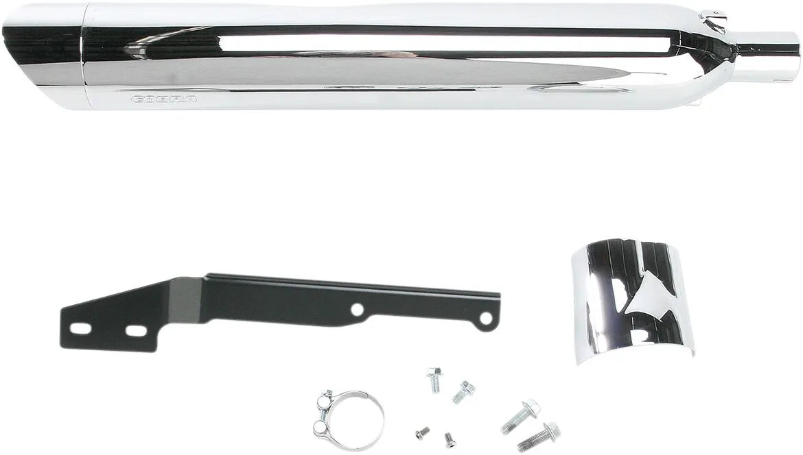 The Cobra 4" Slip-On Muffler is engineered to enhance your riding experience. Crafted from durable mild steel and treated with a four-step chrome-plating process, this muffler not only looks great but is built to last. The 4" muffler body incorporates a cooling chamber with advanced technology, effectively preventing unsightly blueing. The scalloped chromed billet tips add a touch of style to your motorcycle's exhaust system. Installation is straightforward with all necessary mounting hardware and instructions included, ensuring a hassle-free upgrade. Proudly made in the U.S.A., this slip-on muffler combines performance, durability, and aesthetics.