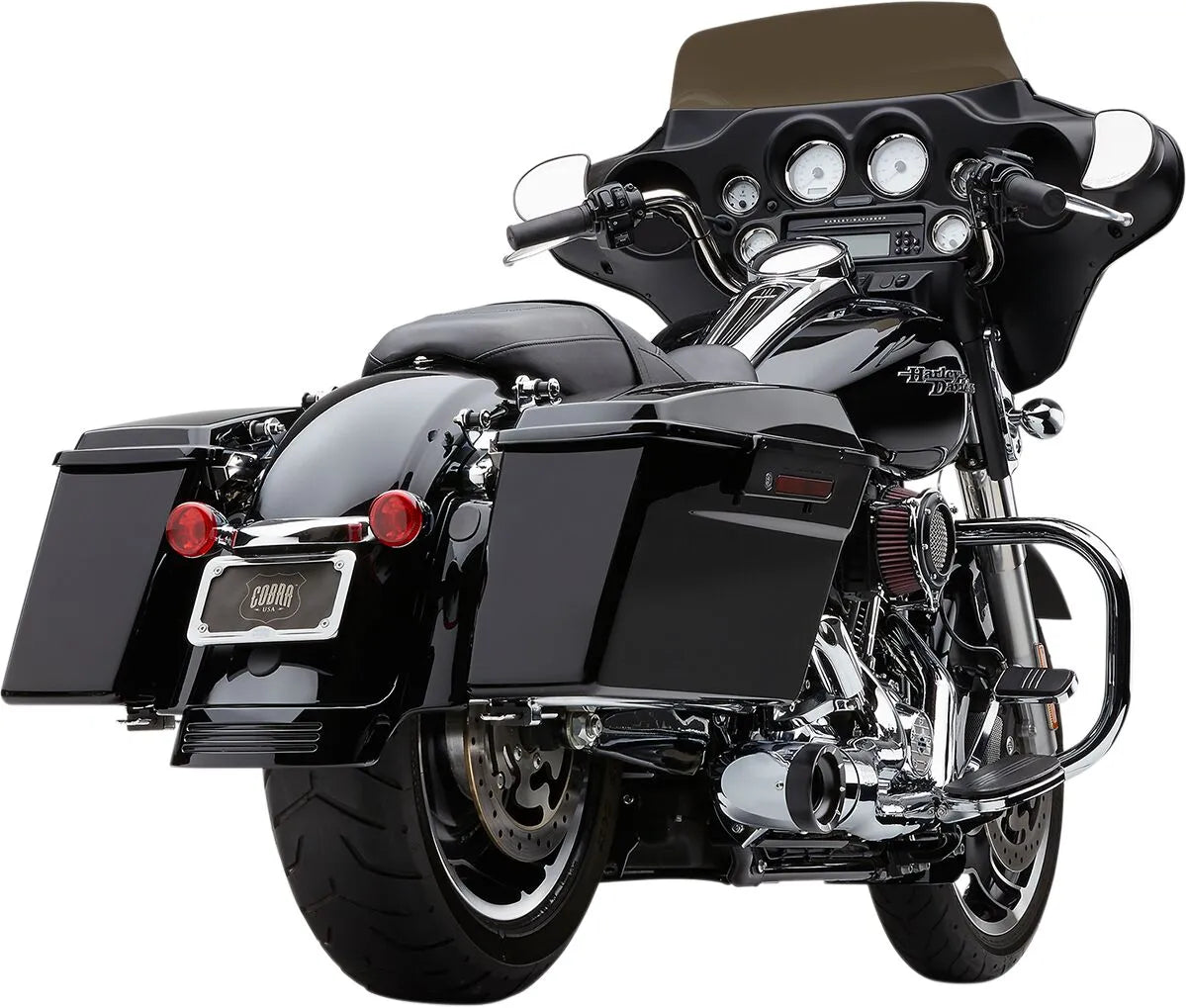 The Cobra Turn Out 2-into-1 Exhaust System is engineered to maximize performance and enhance your bike's aesthetics. The headpipe seamlessly merges into a large 2.25" collector, which then steps up to a 2.5" core, optimizing exhaust flow for increased horsepower and torque. The core is meticulously designed with perforated stainless steel screen wrapping and fiberglass pillow enclosure, delivering exceptional sound quality and heat resistance. The 4" muffler body, finished with a stunning 4" machined aluminum dual-cut tip, adds a touch of modern style to your ride. Compatible with both stock and extended bags, this exhaust system is proudly made in the U.S.A., ensuring top-notch quality and durability. Easy to install with basic tools. Transform your motorcycle into a true performance machine.