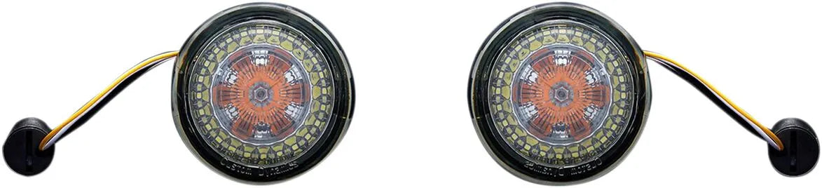 The Custom Dynamics ProBEAM® Amber/White Dynamic Ringz™ utilize cutting-edge LED technology to maximize performance. Featuring unique reflector technology and automotive-grade LEDs, these units are sealed for durability and long-lasting performance. The outer ring consists of 24 white ProBEAM® LEDs that create a smooth, bright halo, functioning as a running light. Complementing this is the center array of 12 amber LEDs, which serve as the turn signal. When the turn signal is activated, the white LEDs completely shut off for the entire turn signal cycle. This provides exceptional clarity and ensures the amber turn signal is highly visible. Easy installation; simply replace your factory front turn signal bulb and lens with these bullet-style turn signal housings for an instant style and safety upgrade. The ProBEAM® Dynamic Ringz™ offer a significant improvement in visibility and style for your Harley Davidson®.