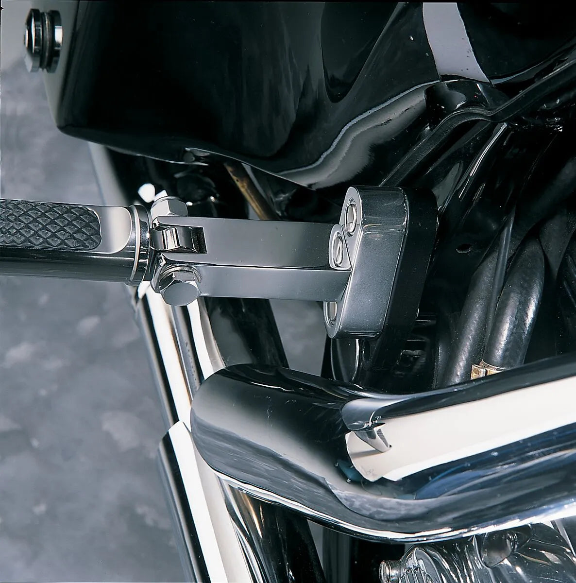 - Replaces OEM floorboards with adaptable foot peg mounts.
