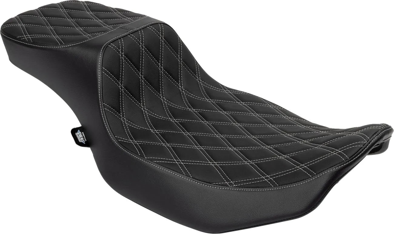 The Drag Specialties Performance Predator 2-Up Seat with Extended Reach combines superior comfort and a sleek design. Featuring automotive-grade vinyl on the sides and a carefully contoured seating area, this seat ensures a comfortable ride every time. The 6" tall driver support enhances your riding posture, while the extended reach design moves the driver back 1-3/4" from the stock position, providing additional room. Crafted with molded polyurethane foam and a 3/16" ABS thermoformed seat base, this seat guarantees maximum comfort, perfect fit, and long-lasting durability. The carpeted bottom and rubber bumpers protect your motorcycle's paint, and the narrow front design allows for better leg clearance. Compatible with all Drag Specialties and most Harley-Davidson sissy bars, this seat is proudly made in the USA.