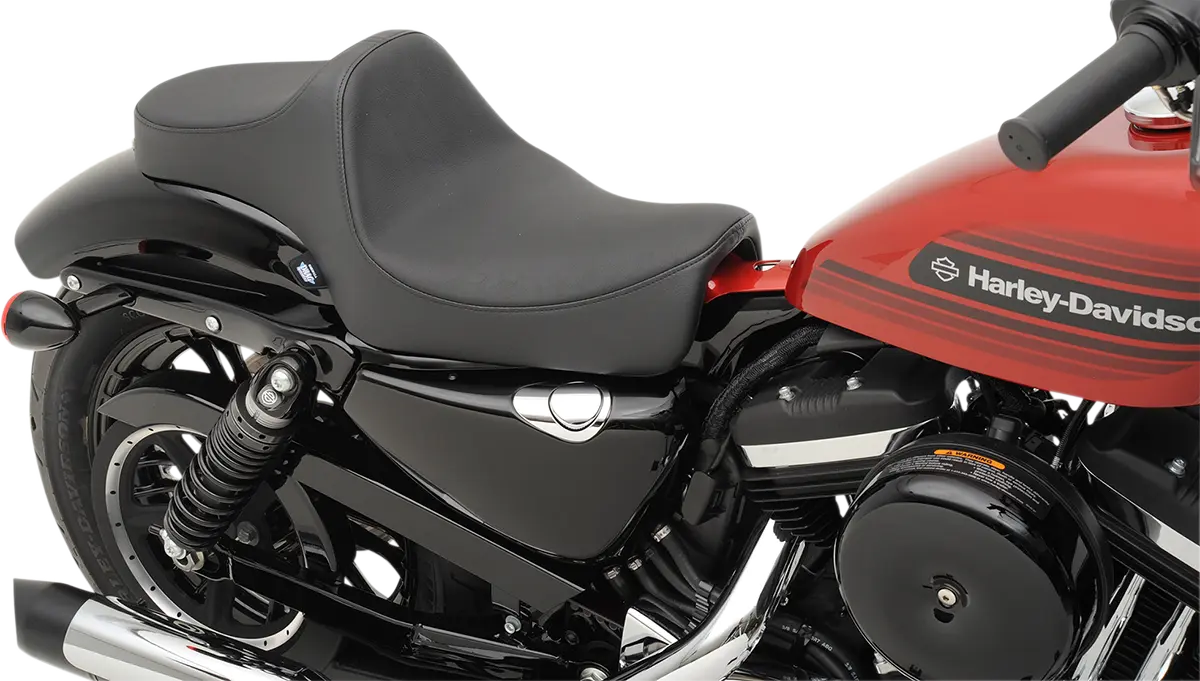 The Predator III seat features an automotive-grade vinyl cover for exceptional durability and a sleek look. Molded polyurethane foam ensures optimal comfort and reduces fatigue, allowing you to enjoy extended journeys. The 3/16" ABS thermoformed seat base guarantees a perfect fit and includes a carpeted bottom with rubber bumpers to protect your motorcycle's paint. Its narrow front design offers improved leg clearance, enhancing your riding experience. Compatible with all Drag Specialties and most Harley-Davidson sissy bars, this one-piece seat combines practicality with a custom aesthetic. Enhance your motorcycle with the Drag Specialties Predator III Seat, delivering both style and comfort on every ride.
