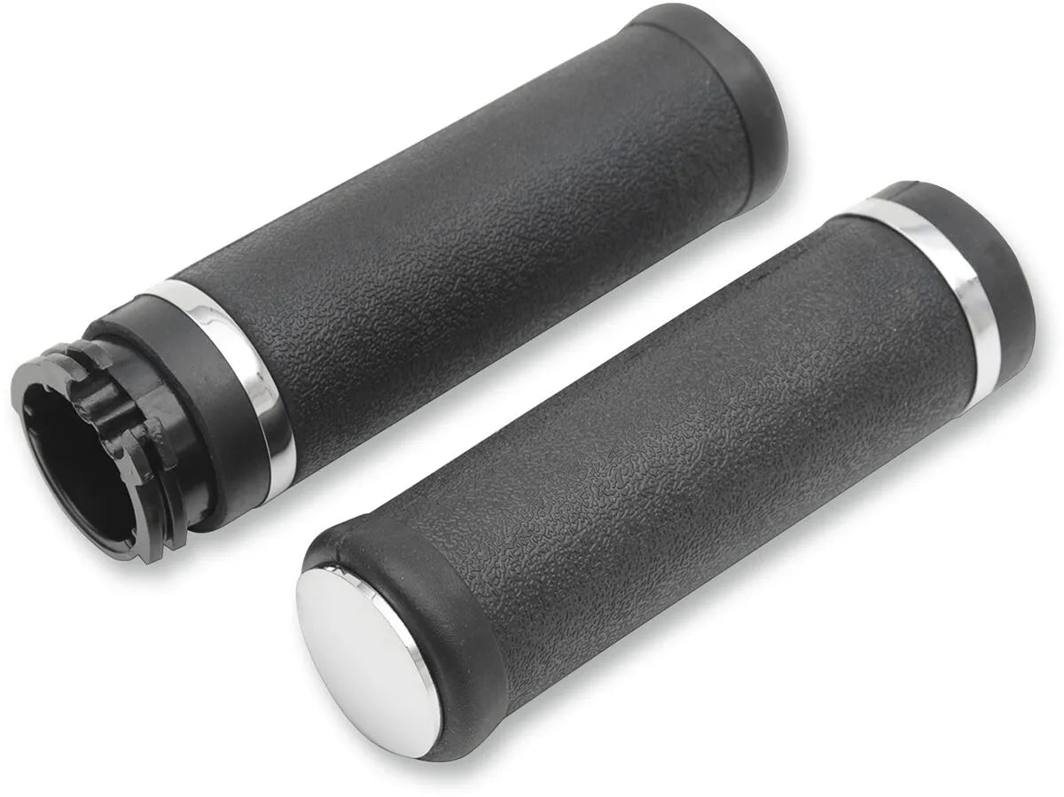 Enhance your motorcycle's style and comfort with these Drag Specialties Rubber Grips. Featuring soft, pliable rubber for superior grip and vibration dampening, these grips provide excellent control and a comfortable feel for long rides. The sleek black rubber is accented by chrome-plated billet aluminum end caps and detail rings, adding a touch of custom style to your bike.
