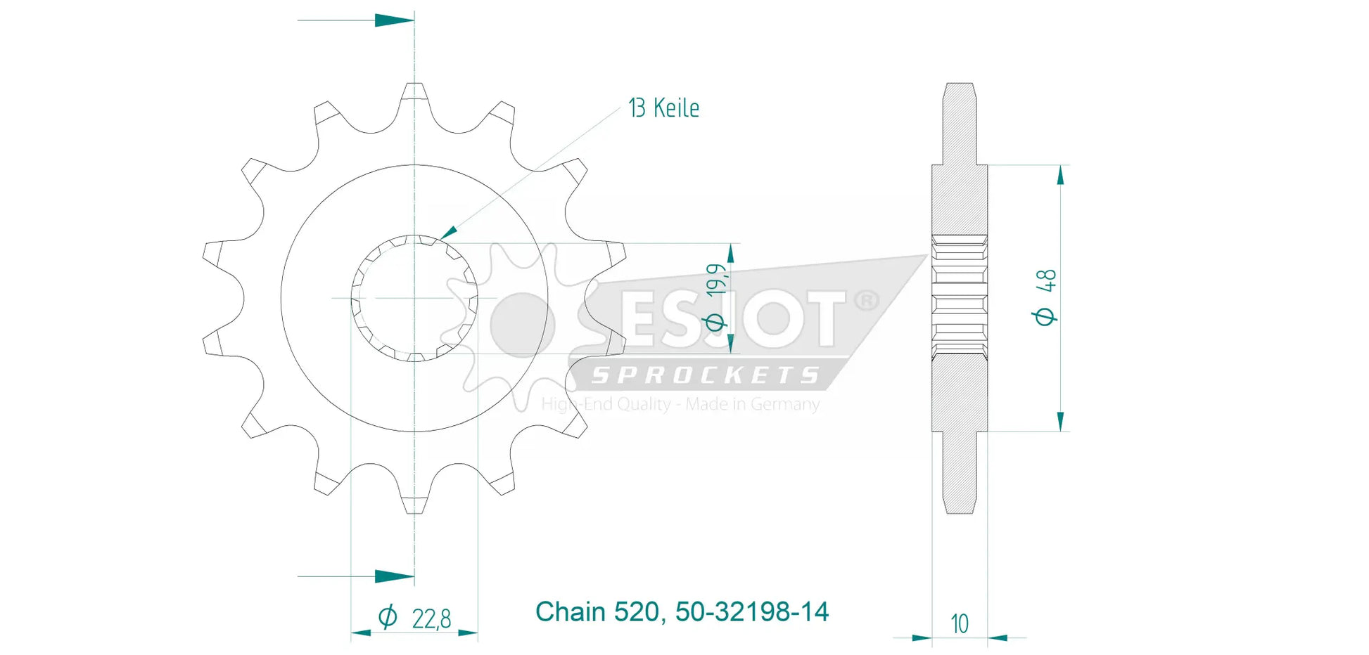 Experience unparalleled reliability with the Esjot 520 Front Sprocket. Constructed from special 16MnCr5 steel, this countershaft sprocket undergoes high-quality case hardening to withstand the most rigorous wear conditions. Its precise gearing, achieved through CNC automatic lathes and state-of-the-art broaching machines, guarantees a perfect fit on the drive shaft with concentricity and axial run-out tolerances of less than 0.1 mm. This ensures smooth, efficient power delivery and extended service life. Ideal for enthusiasts and professionals seeking a dependable and high-performing component, the Esjot 520 front sprocket maximizes your motorcycle's potential. Ride with confidence knowing your drivetrain is equipped with one of the best sprockets available. 100% Made in Germany, guaranteeing top-tier quality and precision.