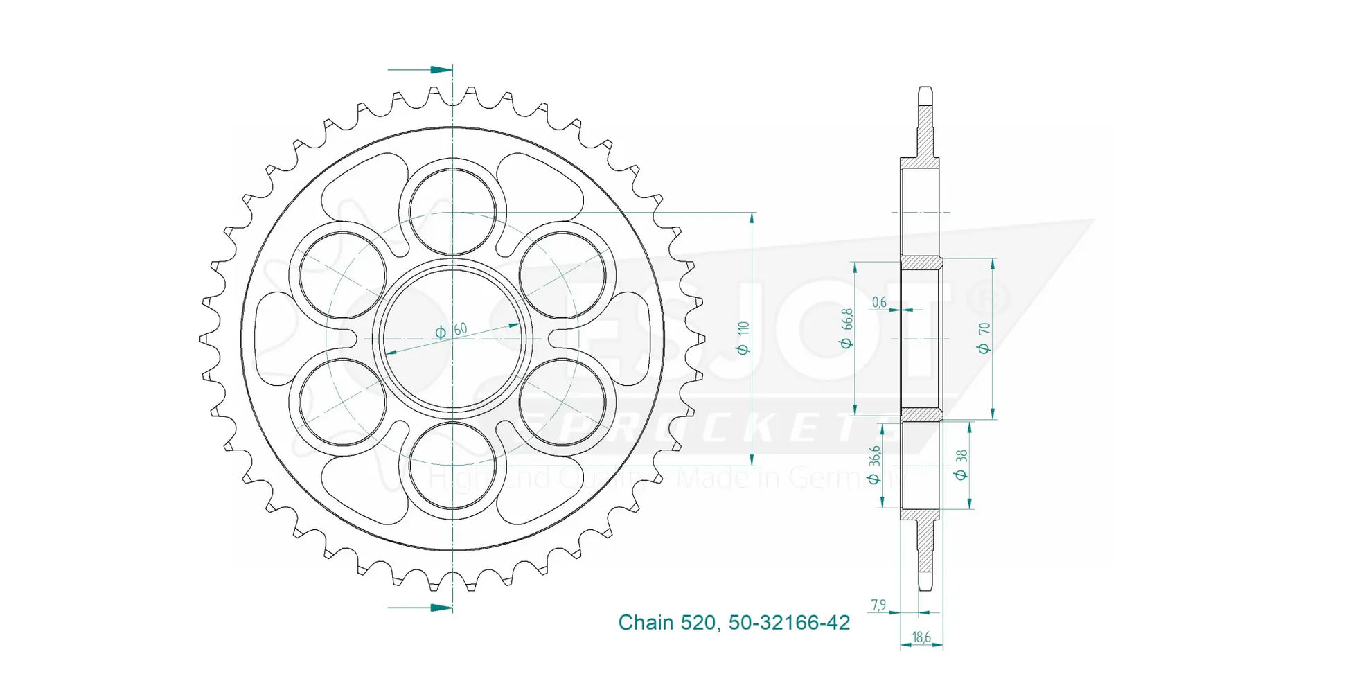 The Esjot Standard Rear Sprocket is meticulously crafted from high-strength C45 steel and finished with a specialized surface treatment for enhanced durability. The precise toothing, achieved through the advanced Diamond Cut 2.0 process, guarantees optimal chain engagement and smooth power delivery. With concentricity and axial run-out tolerances of less than 0.1 mm, this sprocket minimizes vibration and maximizes efficiency. Whether you're navigating city streets or tackling off-road trails, the Esjot sprocket delivers consistent performance and lasting value. Proudly 100% Made in Germany, it represents the pinnacle of engineering and quality.