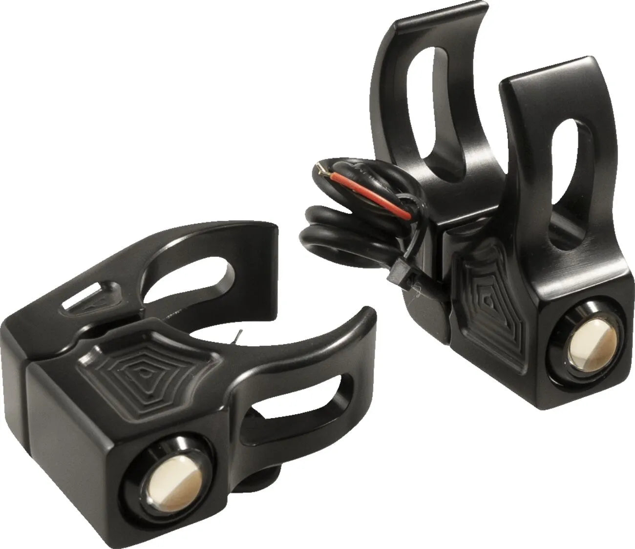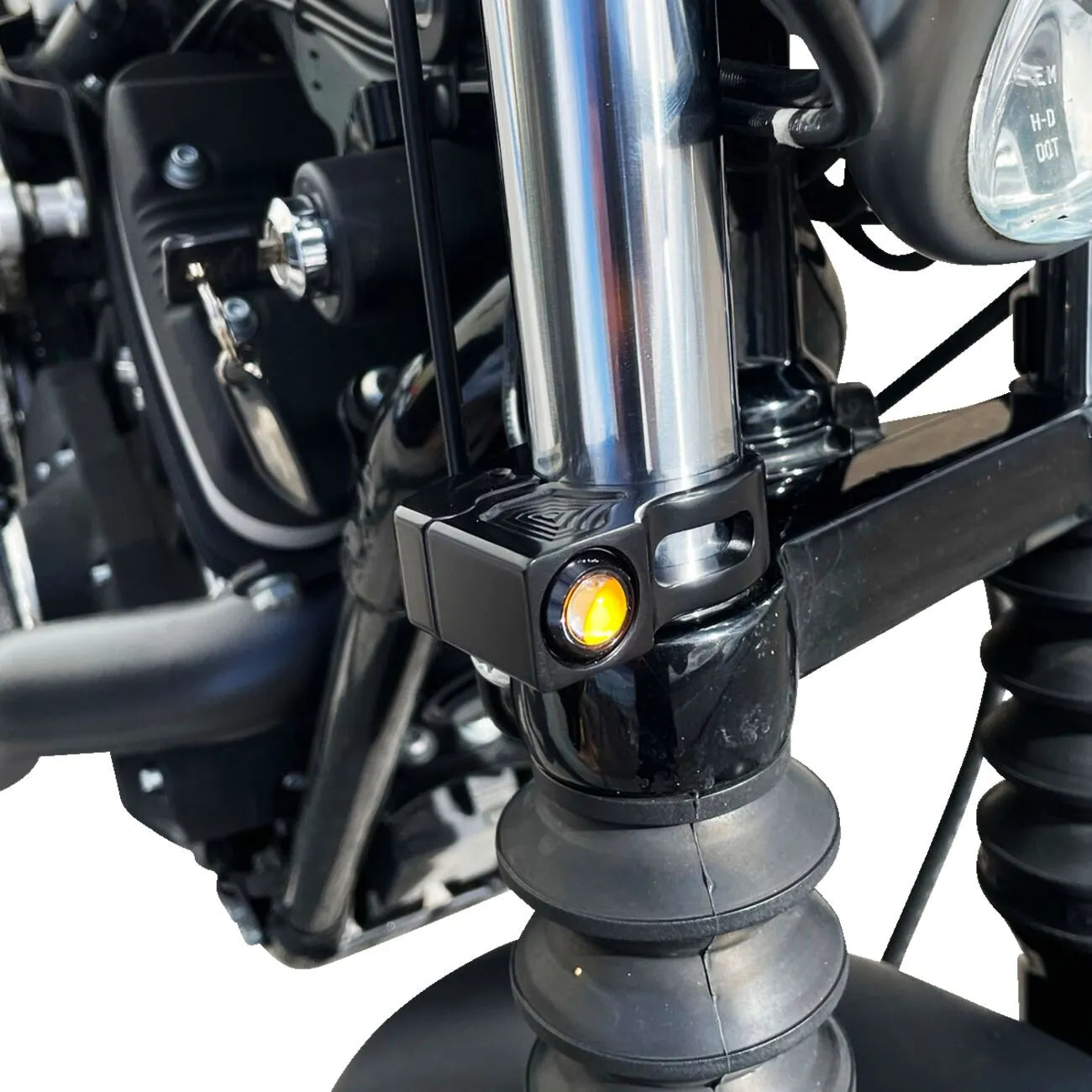 The Joker Machine Fork Mount Turn Signals are CNC machined from billet aluminum, ensuring strength and a precise fit. The unique two-piece claw clamp design allows for easy installation without the need to remove the fork tubes, saving you time and effort. These signals feature bright amber LED lights for enhanced visibility. These lights mount above the lower triple tree, offering a clean and streamlined appearance. These turn signals operate at 12V and are sold as a pair, ensuring both sides of your bike are covered. Enhance your bike's aesthetics and safety with these premium turn signals.