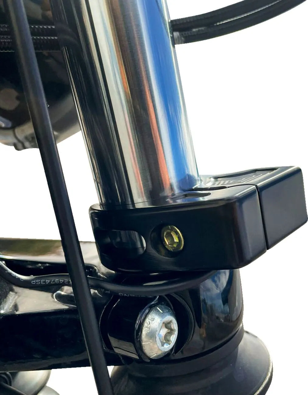 - Two-piece claw clamp allows for easy installation without disassembling the fork.
