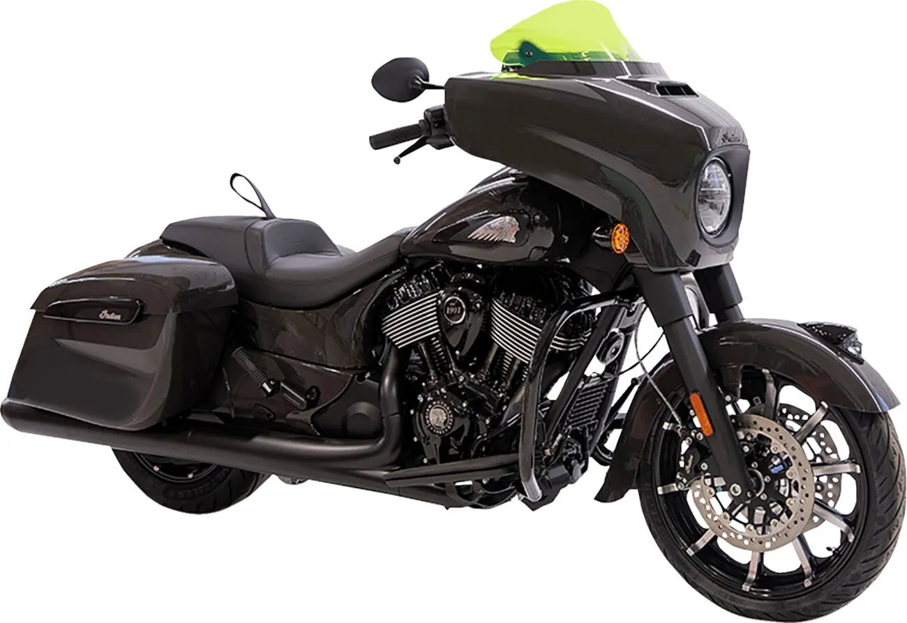 The Klock Werks Kolor Flare™ Ice Windshield is designed to provide superior performance and a unique visual appeal. Its distinctive “hips” at the outer edge redirect wind, increasing downforce on the front of your motorcycle, which significantly improves stability at higher speeds compared to stock windshields. The integrated “flip” at the top is engineered to push air upwards, creating a pocket of cleaner, less turbulent air for both the rider and passenger, enhancing overall comfort during long rides. The vibrant fluorescent edge adds a striking visual element, ensuring your bike stands out. Pre-drilled mounting holes make installation straightforward using your existing stock windshield hardware. Enjoy the perfect blend of style and function with this meticulously crafted windshield.