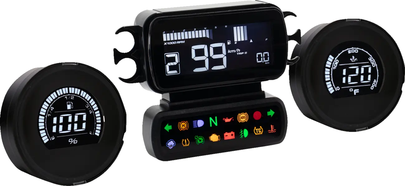 The Koso D2 Gauge Kit provides crucial information at a glance, including engine temperature, battery voltage, tire pressure, and gear indicator. A complete system of indicator lights lets you closely monitor your motorcycle’s vitals. The gauge fits directly into the stock harness and seamlessly integrates with the CANBUS system for hassle-free installation. The 8-color changeable LCD display allows for customizable viewing, enhancing visibility and matching your bike's aesthetics. The D2 Gauge measures 3-7/16" L x 1-1/16" W x 2-5/8" H. The add-on kit, which includes a fuel level and engine temperature meter, measures 2-3/4" in outside diameter and 1-3/4" in depth. Experience enhanced monitoring and control with the Koso North America D2 Gauge Kit.