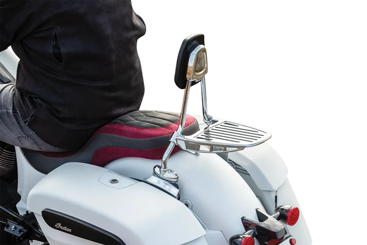 The Kuryakyn Sissy Bar combines durability with a stylish aesthetic. Constructed from robust steel with a premium chrome plating, this sissy bar is built to last and withstand the elements. The included cushioned backrest pad, made from weather- and UV-resistant PU material, offers superior comfort and support. Easily install the sissy bar with the included hardware and mounts, designed for a seamless fit. The backrest pad is also easily removable, allowing you to switch between a comfortable ride and a clean, streamlined look in seconds. Optional luggage rack available separately.