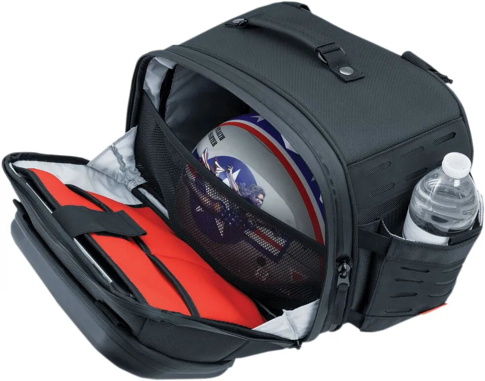 - Clamshell opening with interior mesh fence and side gussets keeps gear secure when accessing the main compartment.
