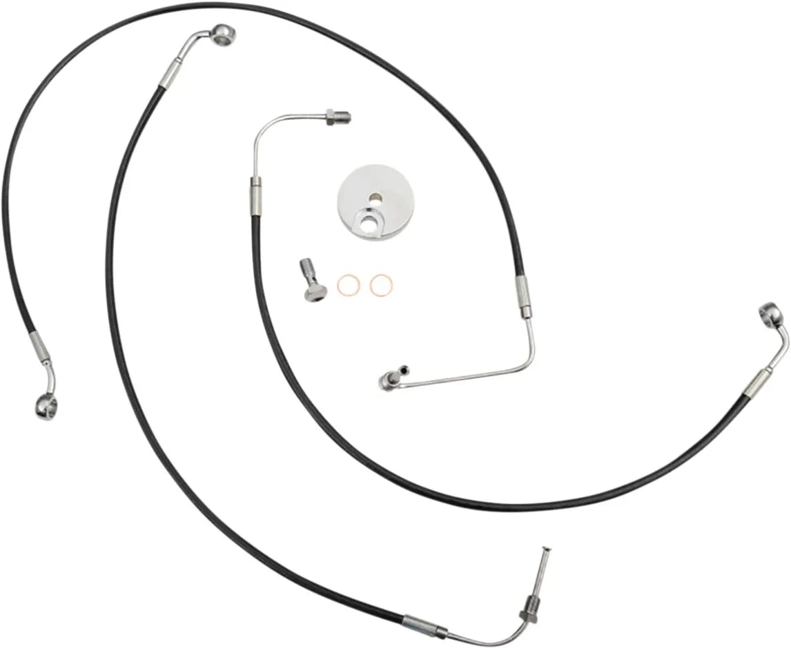 The La Choppers Black Braided Brake Line Kit delivers superior braking performance and a sleek, custom look. Designed for motorcycles with ABS, this kit ensures compatibility and optimal function. The braided stainless steel construction provides exceptional durability and resistance to expansion, resulting in a firmer, more responsive brake feel. The black vinyl coating adds an extra layer of protection against abrasion and the elements while complementing your bike's overall appearance. Made in the U.S.A., this brake line kit is engineered for easy installation and precise fitment, simplifying handlebar swaps and improving your riding experience.