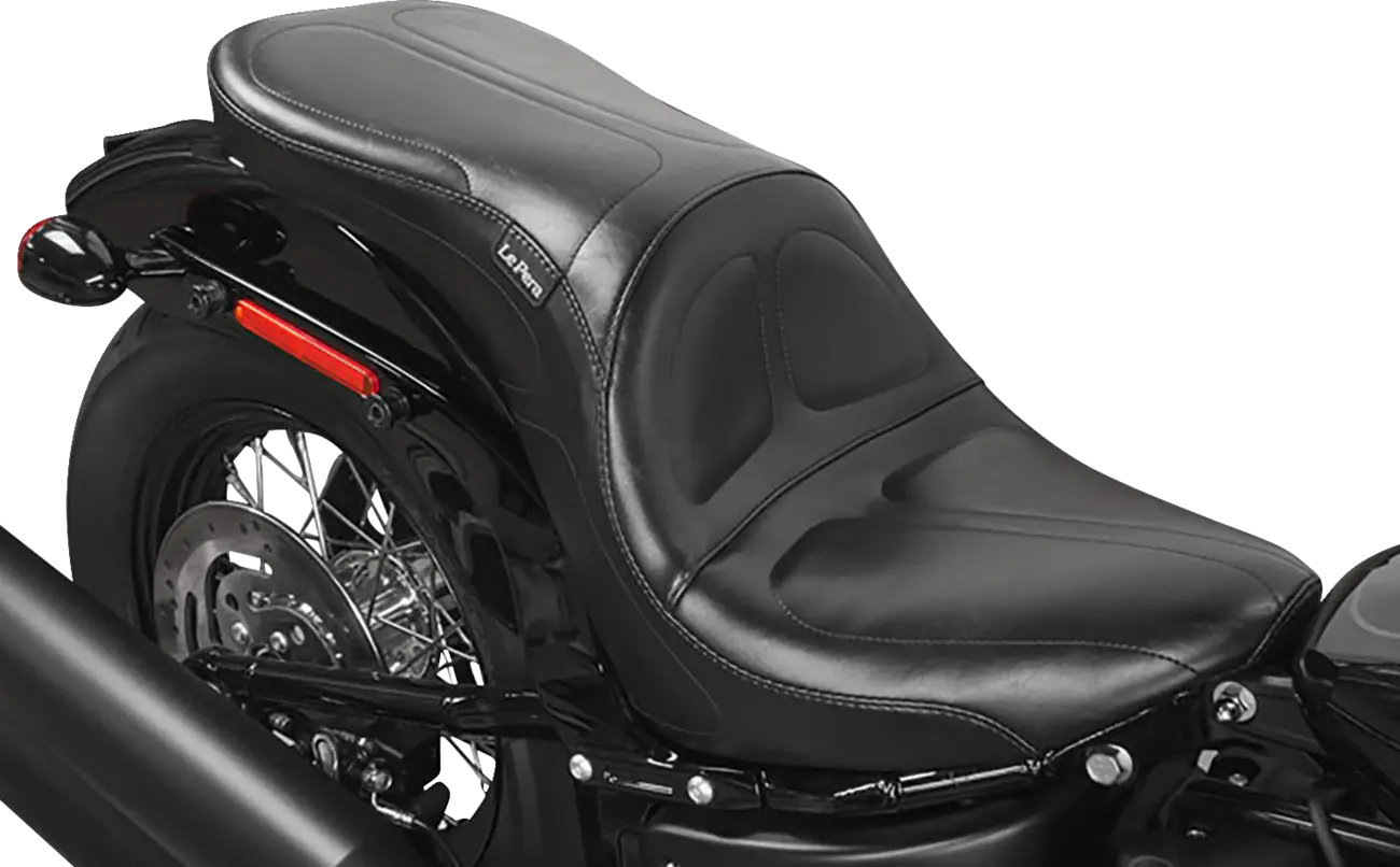 The Le Pera Maverick Seat is engineered to enhance your riding experience. Its special contours offer superior lumbar support, enabling unrestricted movement while maintaining a secure feel. The seat features a molded one-piece foam foundation, ensuring consistent comfort and durability. The premium-grade black vinyl covering provides a sleek, classic appearance that complements any motorcycle. Built on a sturdy 16-gauge powder-coated steel base plate, this seat is designed to withstand the rigors of the road. The carpeted seat bottom protects your fender from scratches and damage, keeping your bike looking its best. Whether you're cruising around town or embarking on a long-distance journey, the Le Pera Maverick Seat delivers unparalleled comfort and style.
