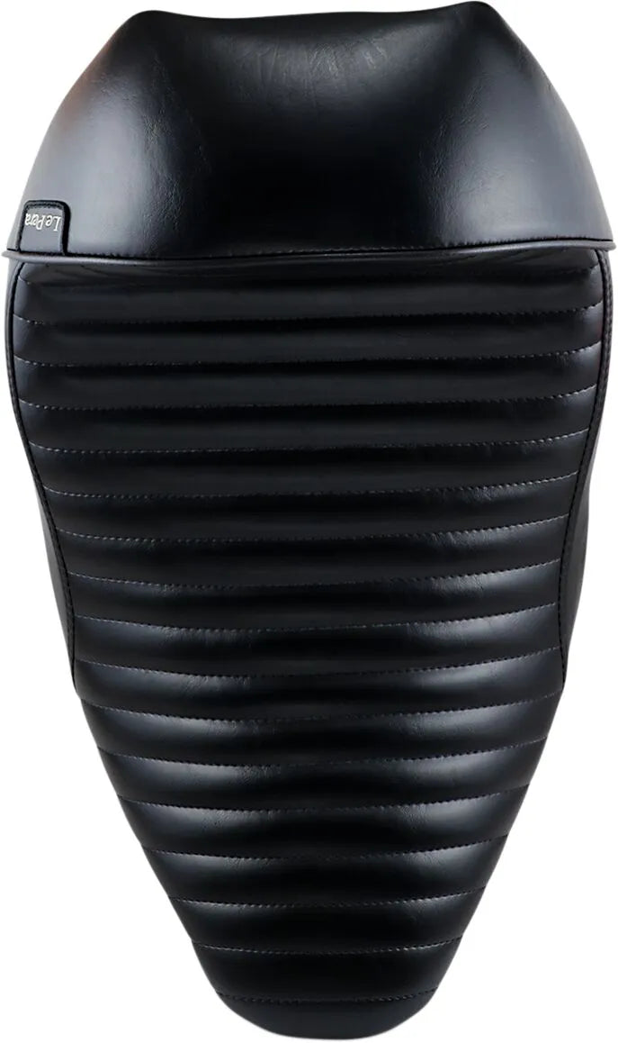 The Le Pera Stubs Cafe Seat delivers both style and comfort for the solo rider. Constructed with a durable, powder-coated 16-gauge steel base plate, it ensures a long-lasting foundation. The base plate is carpeted to protect your fender from scratches and provide a secure, friction-free fit. The seat is covered in high-grade black vinyl, double-stitched with bonded polyester thread for superior durability and a clean, custom appearance. Measuring 18" in driver seat length and 13" in driver seat width, this seat offers a comfortable and secure riding position. This solo seat enhances your motorcycle's aesthetics while providing a comfortable ride. Made with pride in the U.S.A.