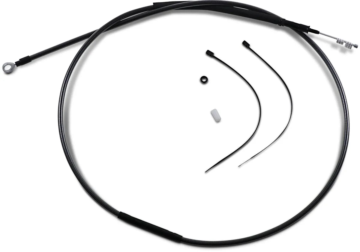 The Black Pearl™ clutch cable features a true black wire braid and black-chrome fittings that seamlessly match other Magnum control cables and brake lines. The cable is coated with a non-yellowing, crystal-clear outer jacket, providing exceptional protection against scuffing to paint and chrome. The low-effort, high-efficiency cable design meets or exceeds all OE specifications, ensuring a perfect fit, robust construction, and superior endurance. Polished and black-chrome plated fittings add to the cable's premium look and feel. An attractive adjuster with integrated water-resistant seals eliminates the need for a boot, while a rubber seal in the transmission fitting prevents fluid leaks. All cables are assembled in the USA and are made with anti-friction inner liners, nylon adjuster inserts, and are factory lubricated to ensure smooth, consistent, and long-lasting operation. This late-style cable is measured with the adjuster completely collapsed.