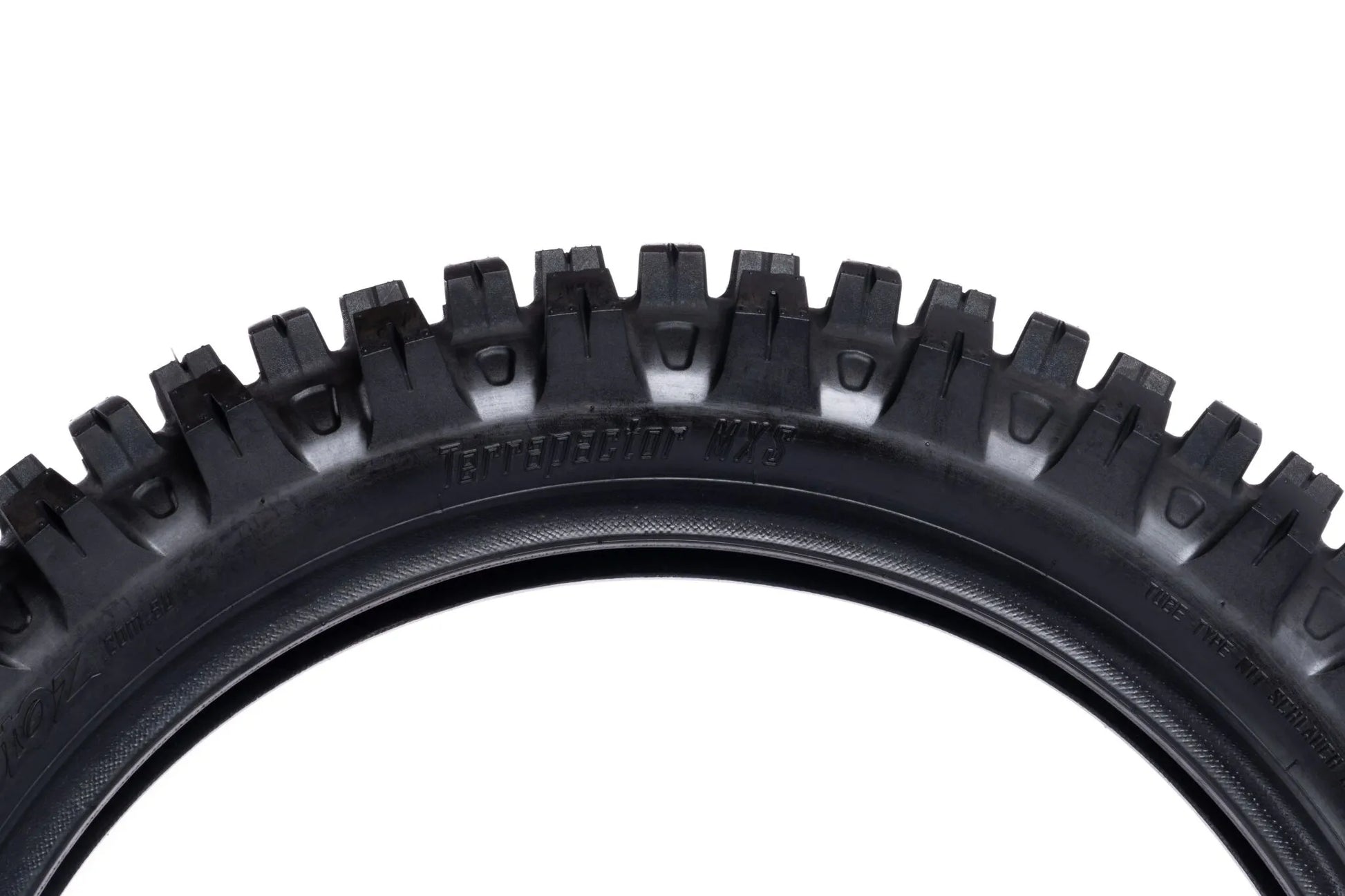 The Terrapactor MXS tire utilizes a lightweight construction, incorporating Motoz's extensive knowledge and expertise to achieve unparalleled performance on soft terrains. Its innovative, chunky, open tread pattern is meticulously designed to prevent mud build-up, ensuring the tread remains clean for consistent grip, even in the stickiest conditions. Cutting-edge tread flex zones are integrated within the tire's carcass and knobs, significantly enhancing flexibility and grip. These flex zones improve cornering grip, drive stability, and the overall feel of the tire during acceleration and cornering. The all-new MX compound further improves the tire's longevity and durability, making it a reliable choice for demanding MX environments. Choose between front tire sizes of 80/100-21 for a traditional feel or the 90/100-21 for an increased contact patch and enhanced feedback in hard-edged ruts. Dominate soft terrain tracks with the Motoz Terrapactor MXS – the ultimate tire for serious MX riders.