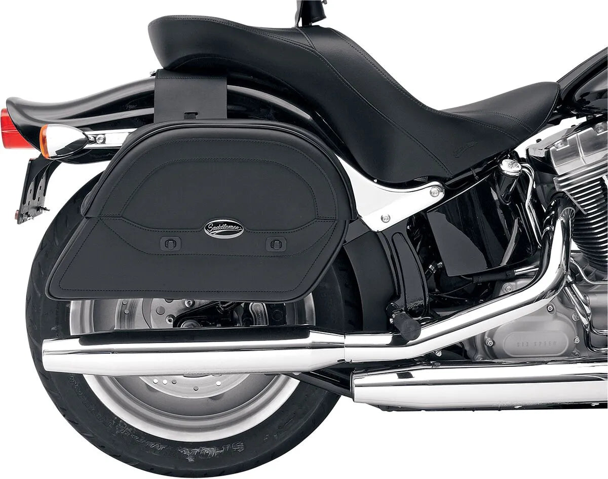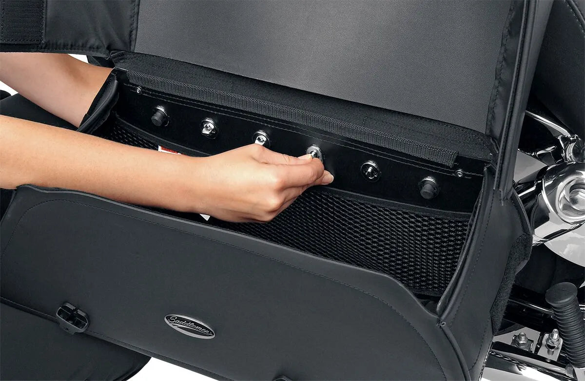 The Cruis'n™ Slant Saddlebags from Saddlemen combine rugged construction with user-friendly features. Made from a durable combination of weather-resistant SaddleHyde™ and a tough plastic frame, these bags are built to withstand the elements and the rigors of the road. The easy-open lid features lockable twist-locks and supplemental hook-and-loop closures, ensuring your belongings stay safe and secure. The rigid construction maintains the bag's shape, even when empty. These slant saddlebags offer a stylish and functional storage solution, enhancing the look and utility of your motorcycle. The extra-strong plastic back integrates seamlessly with the S4 Quick-Disconnect Mounting System for easy installation and removal.