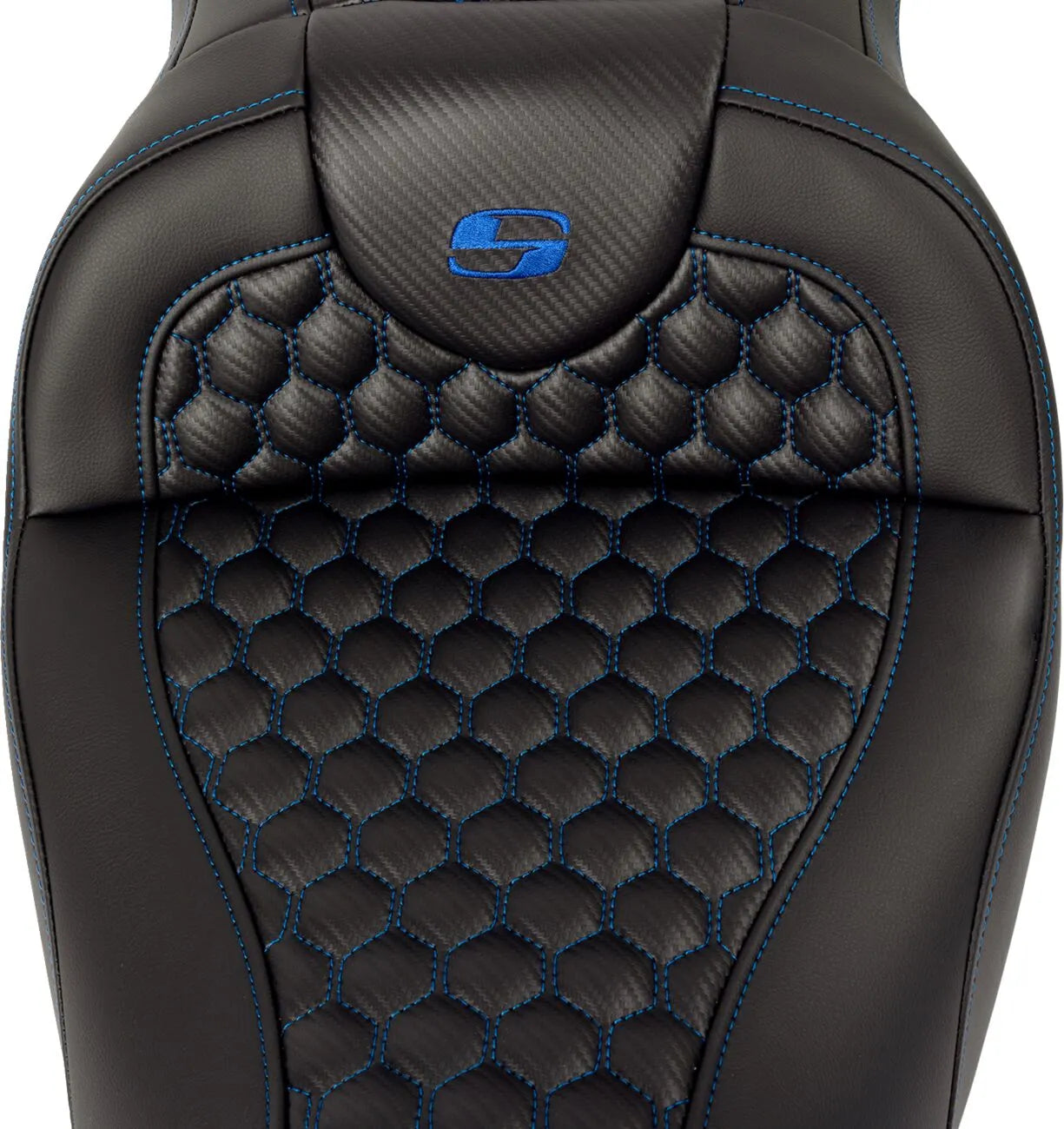 The Saddlemen Honeycomb Roadsofa™ Seat features a unique combination of Gel-Core™ interior and Pro-Foam™ technology. This creates a balanced foam that offers both compression and resilience, essential for long-distance riding. The Pro-Foam™'s self-skinning, element-resistant properties seal out water, enhancing the seat's durability and comfort. The stylish Honeycomb (HC) pattern incorporates modern geometry into the seat cover, while strategically placed SaddleGel™ in both the front and rear reduces tailbone pressure, increases circulation, and maximizes comfort for both the rider and passenger. Crafted with meticulous attention to detail and proudly made in the USA, this 2-up seat is finished with eye-catching blue stitching and carbon fiber weave accents. Upgrade to a Saddlemen Roadsofa and transform your riding experience.