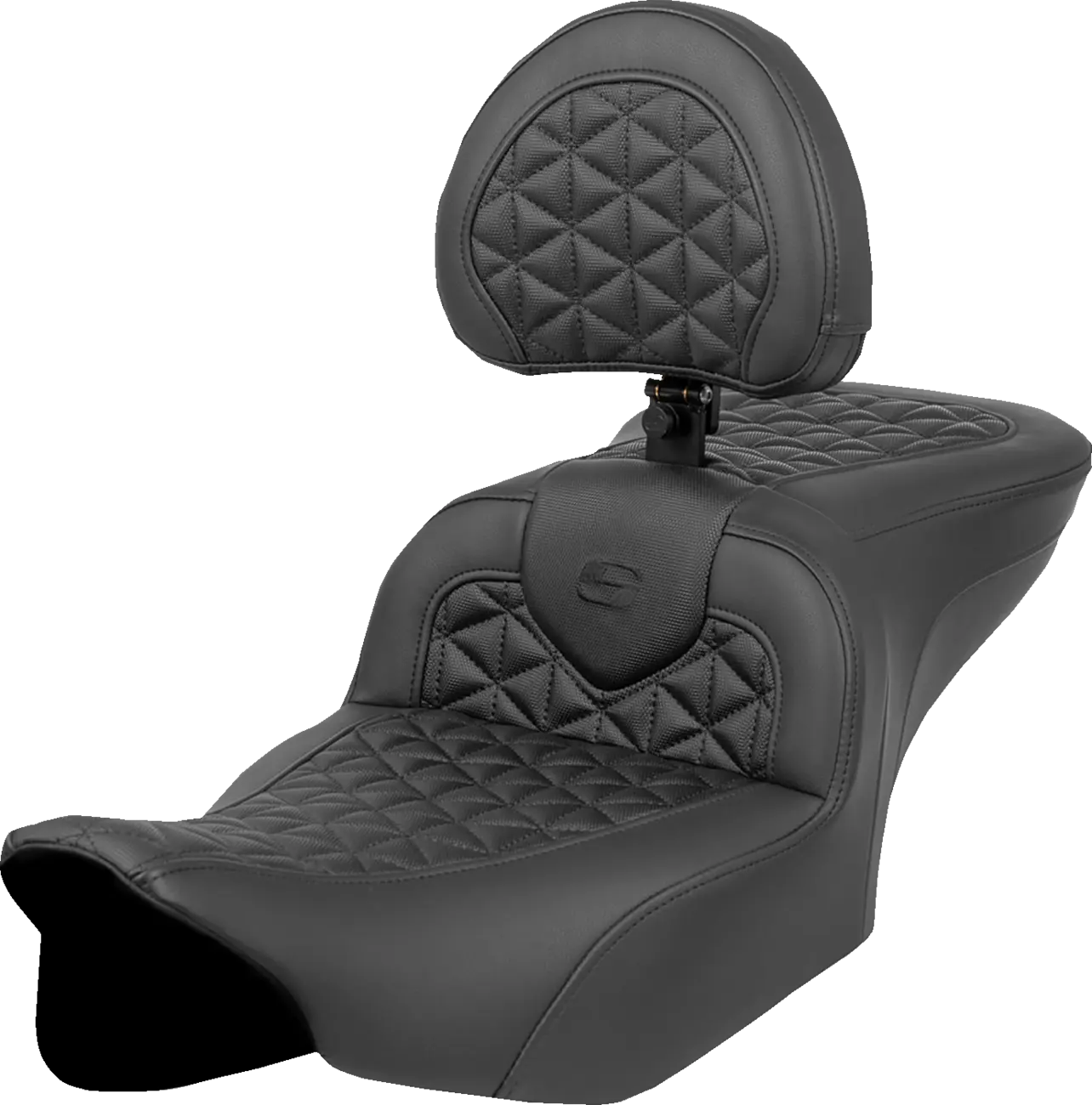 The Saddlemen RoadSofa™ Tri Gripper seat is engineered for high-performance riding and maximum comfort. The unique Tri Gripper cover material keeps the rider securely in place, enhancing control and confidence. SaddleGel™ in both the front and rear reduces tailbone pressure and improves circulation, ensuring a comfortable ride even on long journeys. The tall lumbar support and wide driver saddle provide exceptional back and leg support, while the streamlined nose improves the rider's reach to the ground. The refined split-cushion design further minimizes tailbone and back pressure. Upgrade to the RoadSofa™ and enjoy the perfect blend of performance and comfort.