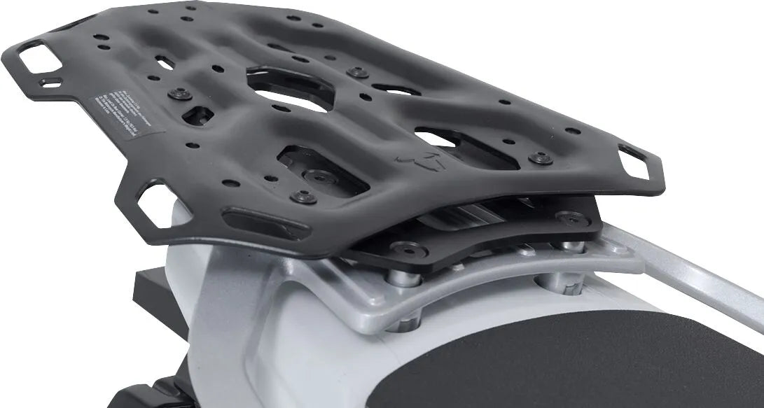 Tested rigorously in both laboratory settings and real-world off-road conditions, the Adventure Rack demonstrates extreme durability against vibrations, impacts, and heavy loads. Its design incorporates multiple functional bores, allowing for the secure attachment of TRAX top cases and SysBag luggage systems (available separately with the appropriate adapter kit). Large lashing eyes facilitate easy rigging of luggage, accommodating 25 mm fasteners for versatile carrying options. The rack features an especially large contact surface—32.9 cm wide at the front and 22.5 cm at the back, with a length of 30.3 cm—to distribute weight effectively and prevent shifting. Installation is straightforward, utilizing original attachment points with bike-specific hardware. A black powder coating provides effective corrosion protection, ensuring long-lasting performance and a sleek appearance. Constructed from a light yet sturdy 4mm-thick aluminum alloy, the SW-Motech Adventure Rack delivers strength without adding unnecessary weight to your motorcycle.