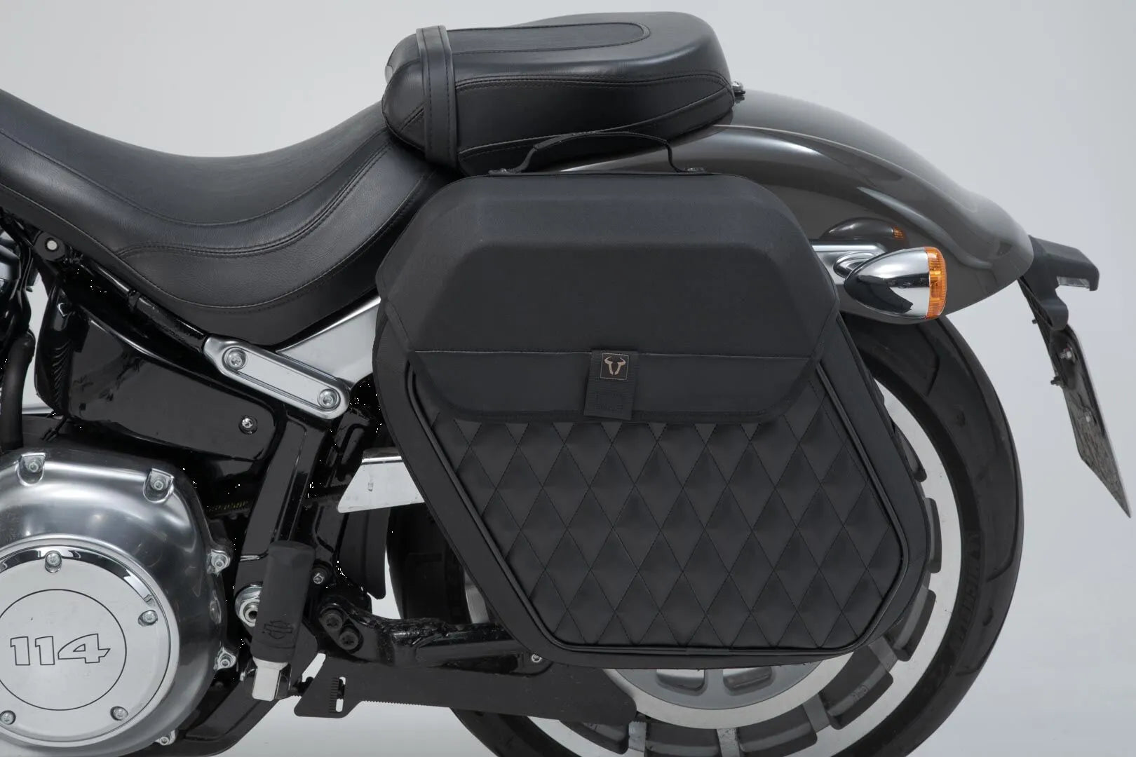 This bike-specific bag carrier mounts effortlessly to the original attachment points on your fender strut. The quick-lock system enables you to attach and remove LH Legend Gear side bags with just a few simple hand movements, ensuring your luggage is securely fastened without compromising convenience. Specifically developed for Harley-Davidson models, this side carrier is also compatible with Harley-Davidson original accessories such as sissy bars and racks. The robust stainless steel construction ensures long-lasting durability and a sleek appearance. The powder-coated black finish adds a touch of style while providing additional protection against the elements. Enjoy the freedom to carry your essentials with confidence and style, knowing your luggage is securely mounted and easily accessible.
