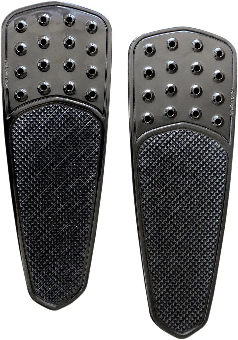 These Accutronix Extended Front Floorboards are expertly machined from 6061 T-6 billet aluminum, ensuring exceptional durability and a premium feel. Designed for the driver, they extend 2.5" in both the front and rear, providing significantly more foot room and leverage. They are also 0.75" wider than stock floorboards, enhancing stability and reducing foot fatigue on long rides. The multi-directional, slip-resistant pyramid-top rubber inserts (or knurling, depending on the model) offer superior grip in all conditions. Featuring a drilled raised hole design inspired by racing pedals, these floorboards not only look great but also provide added traction. Installation is a breeze, as they directly replace stock H-D® boards using the existing hardware. Proudly made in the USA, these floorboards are a testament to quality craftsmanship and performance. Enhance your ride with Accutronix, the choice of discerning riders.Features & highlights