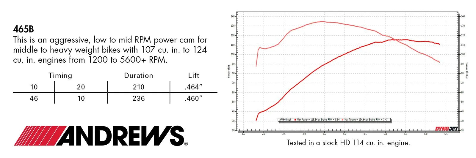 The Andrews 465B Cam is engineered to provide a significant boost in torque and horsepower for 107"-117" engines. Designed as a bolt-in replacement, this cam allows for straightforward installation without requiring extensive modifications. It is specifically optimized for heavy and middleweight bikes, ensuring strong performance across a wide RPM range. The 465B cam provides excellent street manners and is compatible with stock valve springs, simplifying the upgrade process. Manufactured in the USA, this cam guarantees high-quality materials and precise engineering for long-lasting reliability and performance. Cam specs are measured in the engine on the lifter at 0.050" using a 1.61 rocker arm ratio, ensuring accurate performance data.
