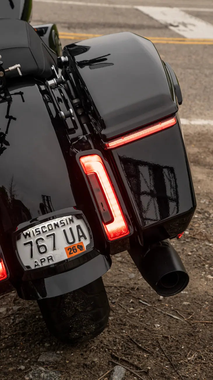 The Ciro Bag Blades® with Lightstrike® dramatically improve your motorcycle's rear visibility, making you more noticeable to other drivers. Featuring run, turn, and brake dual-function LEDs, these lights ensure maximum safety on the road. The high-strength polycarbonate lenses are built to withstand the elements, providing long-lasting durability and a crystal-clear light output. Installation is a breeze thanks to the pre-applied 3M VHB adhesive, eliminating the need for drilling and ensuring a secure fit. Simply plug-and-play with the Standard Harness (part # 2120-1418) or unlock advanced customization options with the Lightstrike COMMANDER™ (part # 2050-0551), sold separately. When paired with the Lightstrike COMMANDER™, you can choose between red or amber turn signals and access various lighting modes and animations to personalize your ride. Upgrade your Harley-Davidson with Ciro Bag Blades® and ride with confidence.