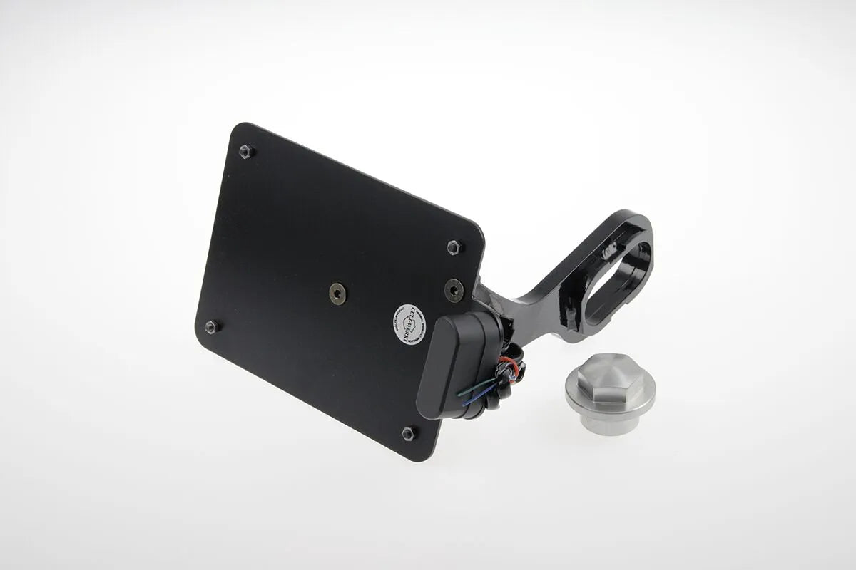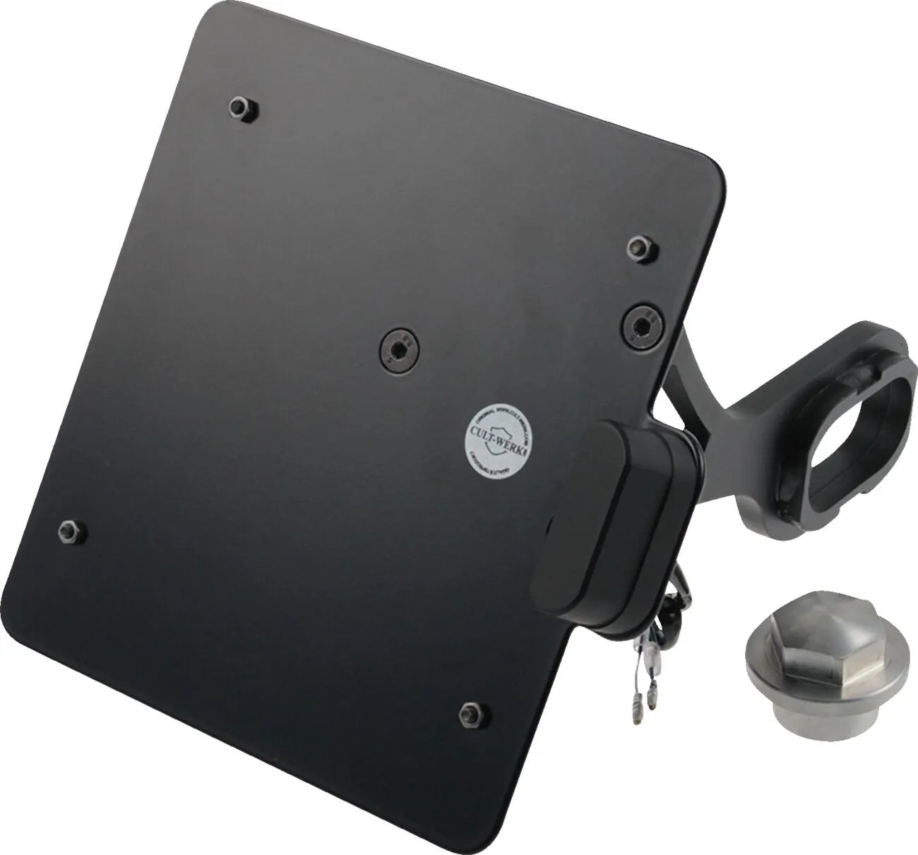 The Cult Werk License Plate Holder is constructed from robust, CNC-lasered steel for precise fitment and exceptional strength. A durable black powder-coat finish provides corrosion resistance and a modern aesthetic that complements any motorcycle. The integrated LED license plate light ensures optimal visibility and meets E-test mark standards, making it street legal. Installation is straightforward, offering a seamless upgrade to your bike's rear end. Enhance the look of your motorcycle with this premium, meticulously crafted license plate holder.
