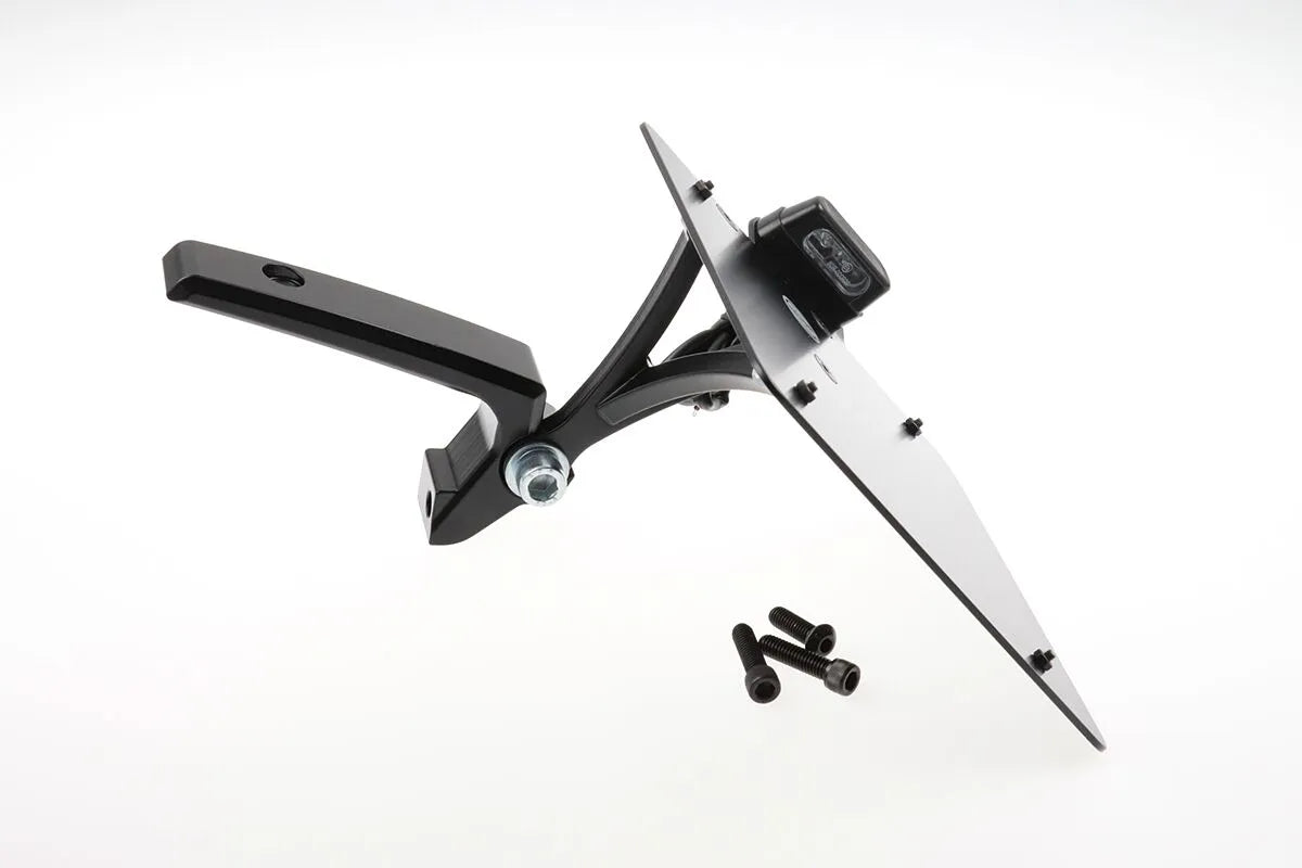 Crafted from robust steel, this license plate holder is CNC lasered for precision and then powder-coated in black for a lasting finish. The durable construction ensures it withstands the rigors of the road, providing reliable support for your license plate. This kit includes an LED license plate light with an E-test mark, guaranteeing both visibility and legal compliance. Installation is straightforward, making it an ideal choice for both professional builders and DIY enthusiasts. Enhance your motorcycle's aesthetics while maintaining safety and legal standards with this premium license plate holder from Cult Werk.Features & highlights