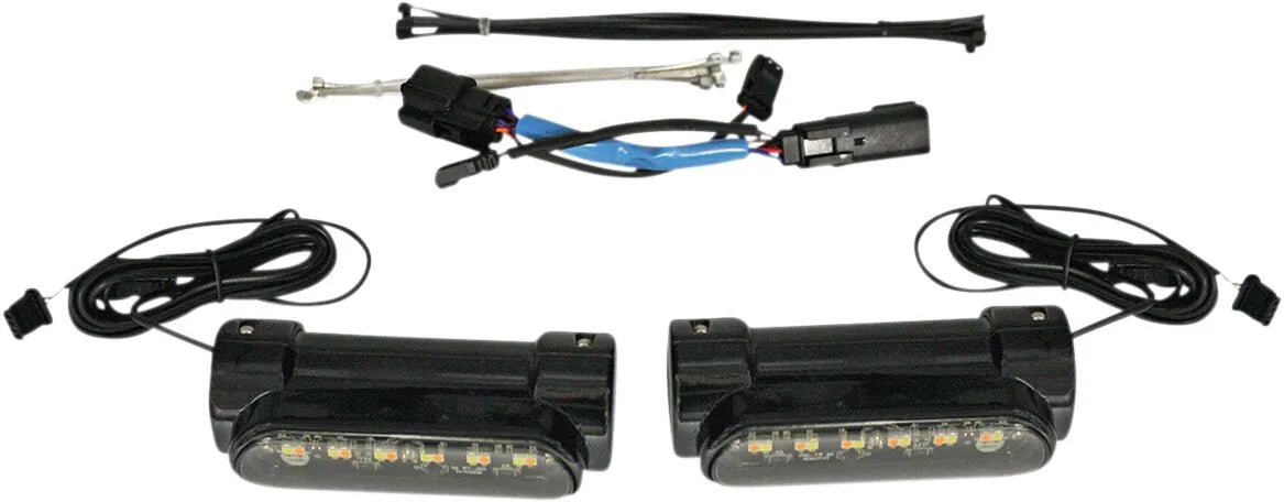 The Custom Dynamics Dynamic Engine Guard LEDs feature six bright white running LEDs and six amber turn signal LEDs per unit, dramatically improving your motorcycle's visibility. The die-cast aluminum housing provides durability and a stylish look, finished in black with smoke lenses. Designed for direct bolt-on installation on 1-1/4" engine guards, these lights require a 5" straight mounting area, simplifying the upgrade process. The included plug-and-play wire harness makes installation straightforward, minimizing the need for extensive modifications. Enhance your safety and aesthetic appeal with these high-quality engine guard LEDs from Custom Dynamics.