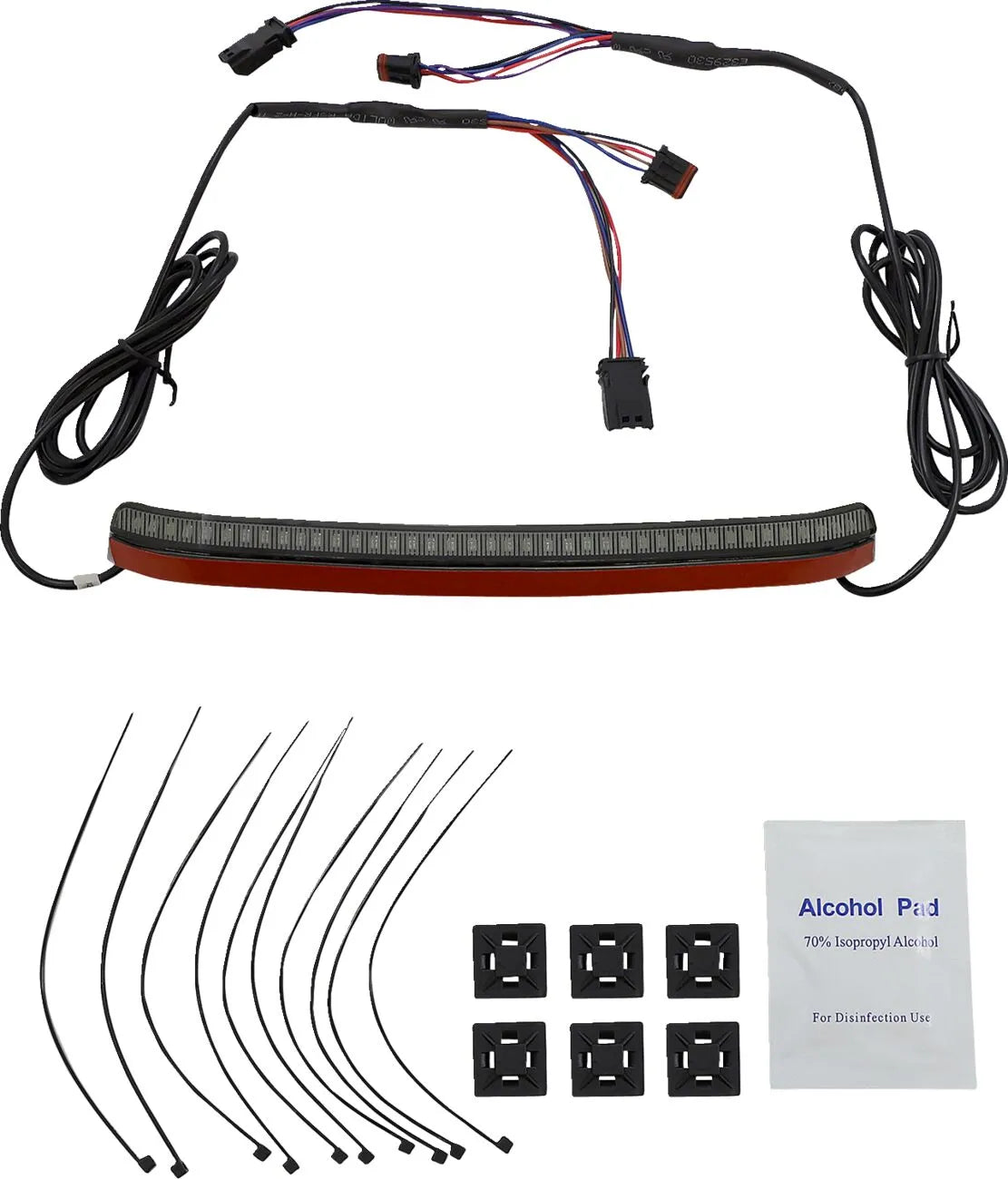 The Custom Dynamics Integrated LED Taillight offers a significant upgrade in brightness and functionality compared to stock taillights. Featuring 40 super bright LEDs, this unit functions as a running light, brake light, and turn signals. The left and right turn signals are clearly defined, splitting the taillight bar with 20 red LEDs per side. Installation is a breeze thanks to the included double-sided automotive-grade tape and plug-and-play design, making it compatible with many Harley-Davidson models. Enhance your motorcycle's visibility and add a custom touch with this high-quality LED taillight assembly. The smoke lens adds a touch of modern style, complementing various bike aesthetics.