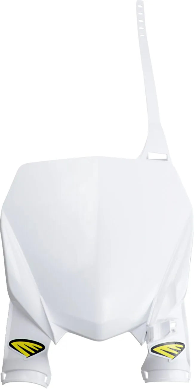 Enhance your bike's aesthetics and functionality with the Cycra Stadium Number Plate. Its ultra-lightweight and slim profile doesn't compromise on durability, making it ideal for demanding riding conditions. The number plate includes a Works cable guide and a crossbar strap for secure and organized cable management. Designed for top mounting, it wraps securely around the fork tubes for a snug fit. Older models feature an upper mounting bracket to accommodate front mount triple clamps, providing versatility across different bike setups. The included white and black screens allow for customization to match your bike's color scheme. Proudly made in the U.S.A., this number plate guarantees high-quality construction and performance.