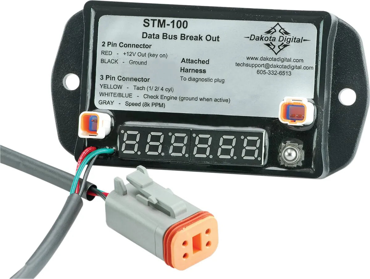 The Dakota Digital Data Bus Breakout Interface, also known as the Dakota Digital STM-100, plugs directly into your motorcycle's diagnostic port, tapping into the bike's data bus to output traditional analog signals. This eliminates the need for splicing into factory wiring, making the installation process quicker and cleaner. It provides reliable outputs for speedometer signals at 8000 ppm, a tachometer signal adjustable for 1, 2, or 4-cylinder engines, a check engine signal, accessory power, and ground. Enhance your diagnostic capabilities with the digital readout feature, which functions as a scan tool, enabling you to read and clear diagnostic codes effortlessly. This interface ensures compatibility and accurate readings for aftermarket gauges, enhancing your motorcycle's instrumentation setup.