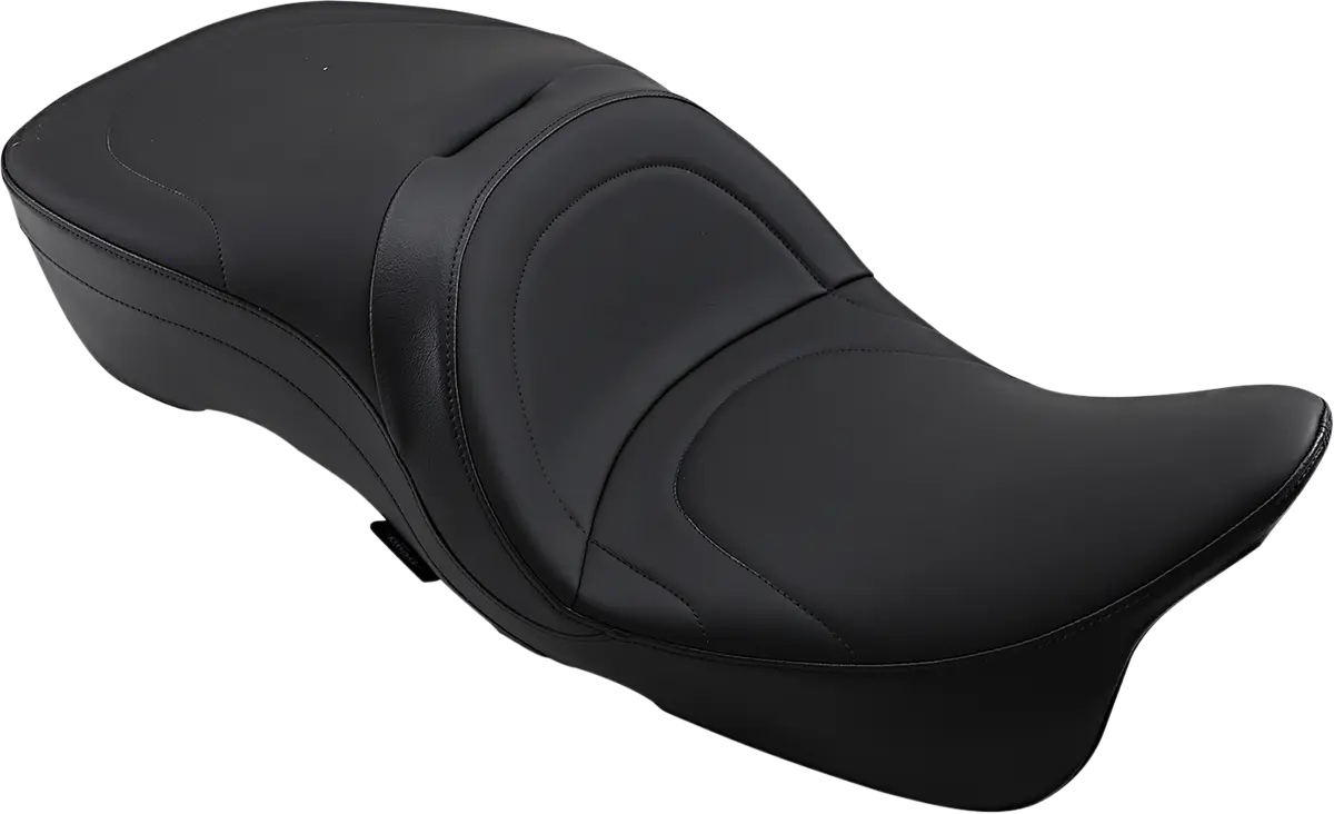 The Drag Specialties 2-Up Touring Seat features solar-reflective leather in the seating area, which is paired with automotive-grade vinyl on the sides. This patented process reduces the surface temperature by up to 25°F, ensuring a cooler, more comfortable ride, and extending the seat's lifespan. The driver area is designed with a narrow cut in the front, sitting approximately 1" lower than the stock seat, promoting better control and ergonomics. The seat showcases improved styling and shape for enhanced comfort. It seamlessly integrates with Harley-Davidson® OEM frame-mounted mechanisms and backrest pads. Constructed with molded flexible urethane foam, this seat provides maximum comfort and support. The 3/16" ABS thermoformed base guarantees a perfect fit, while the carpeted bottom, equipped with rubber bumpers, protects your motorcycle's paint. All necessary mounting hardware is included for easy installation.