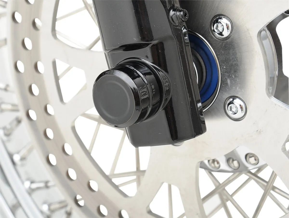 These billet axle caps are precision machined from high-grade aluminum, ensuring durability and a flawless finish. The semi-gloss black finish adds a sleek, custom look to your motorcycle's front axle. They firmly attach to the axle head and nut using high-quality setscrews, providing a secure and reliable connection. Designed for a 1.130" axle head with a 5/16" axle nut, these caps offer a perfect fit for compatible models. Enhance your bike's aesthetics and ensure a secure front axle with these premium billet axle caps.