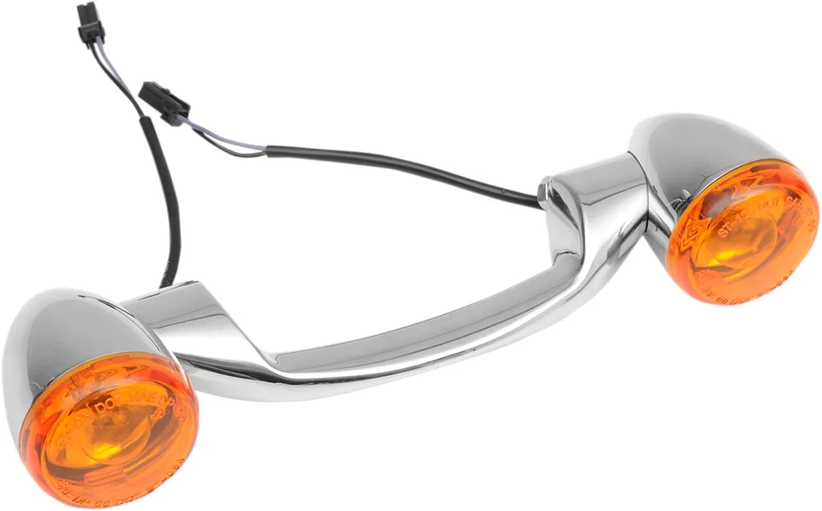 The Drag Specialties Bullet-Style Rear Turn Signal Kit replaces your stock turn signals with a stylish and functional alternative. Featuring a narrow-profile chrome mounting bar and bullet-style turn signals with amber lenses, this kit delivers a clean, streamlined appearance. The bright amber lenses ensure excellent visibility, increasing your safety on the road. Easy to install and built to last, this kit is a simple way to upgrade your motorcycle's aesthetics and functionality. The kit includes 1156-style bulbs ensuring immediate operation upon installation. Enhance your ride with these chrome bullet turn signals that offer a custom look with practical benefits.