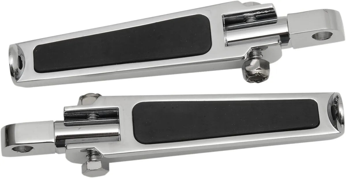 These Drag Specialties foot pegs enhance your riding experience. The fold-up design provides added convenience and safety, allowing the pegs to retract upon impact. The chrome finish ensures a sleek, polished look that complements any motorcycle. Constructed from high-quality materials, these foot pegs are built to withstand the rigors of the road. The rubber inlay provides excellent grip and vibration dampening for increased comfort during long rides. Easy to install with a male mount, these folding foot pegs are an ideal upgrade for improved performance and aesthetics. Sold in pairs for a complete installation.